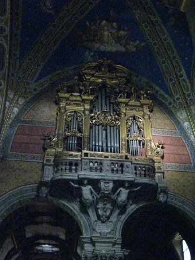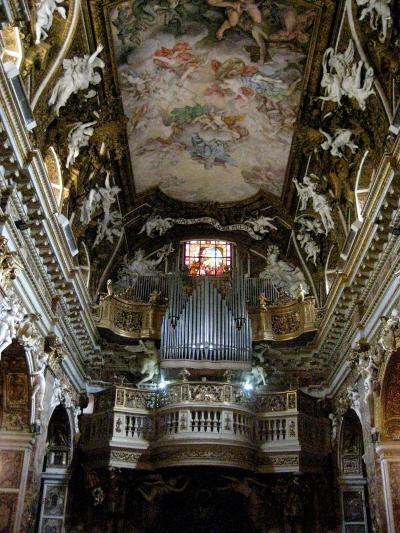 教会の外観からは想像もできない内観は、バロックの粋を極めた装飾が見事で、天井のフレスコ画やクーポラなど見所も多い教会です。