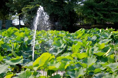 この公園の中には、古代ハスの仲間「大賀ハス」の群生する蓮池があって、毎年6月の後半から7月にかけて、蓮の花が開花する午前中に訪れる人が多い。身長と同じ位の葉っぱと大輪を咲かせた蓮の花のピンクが見事です。