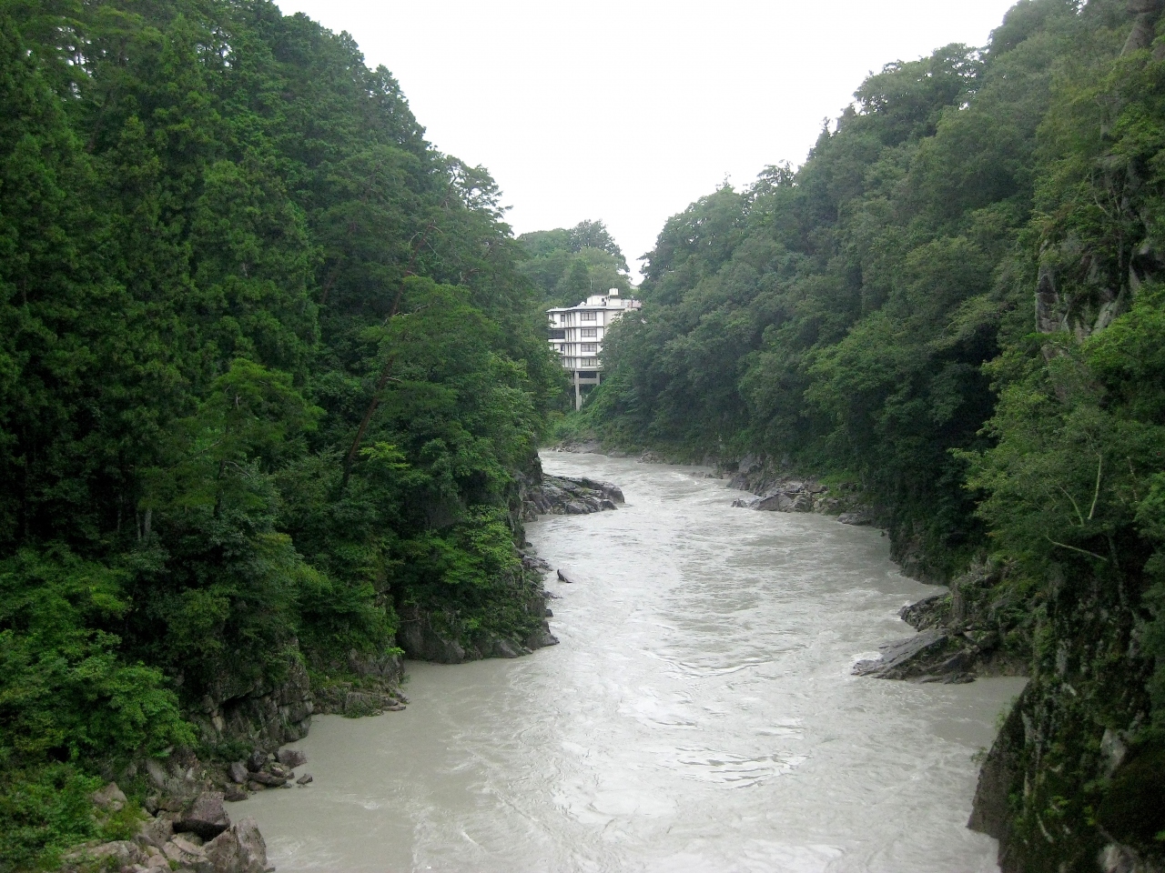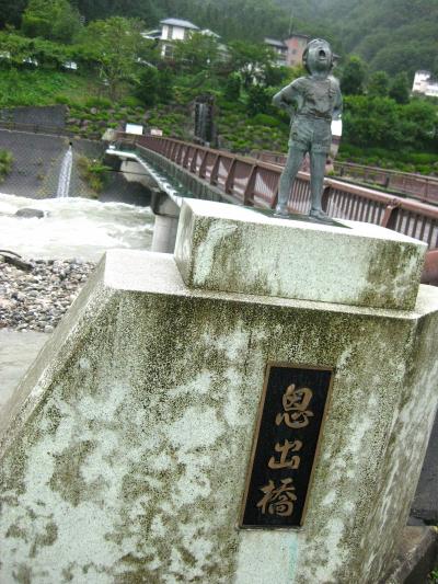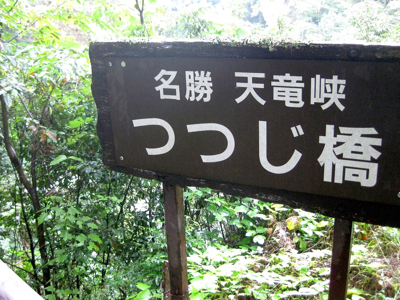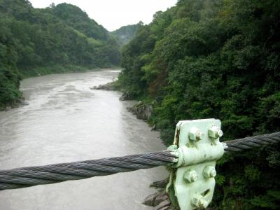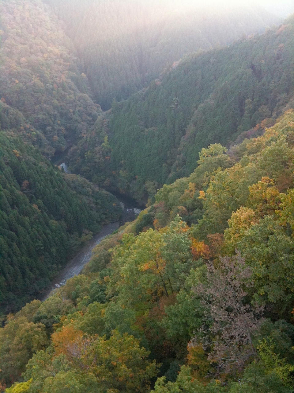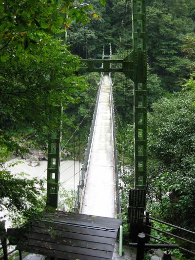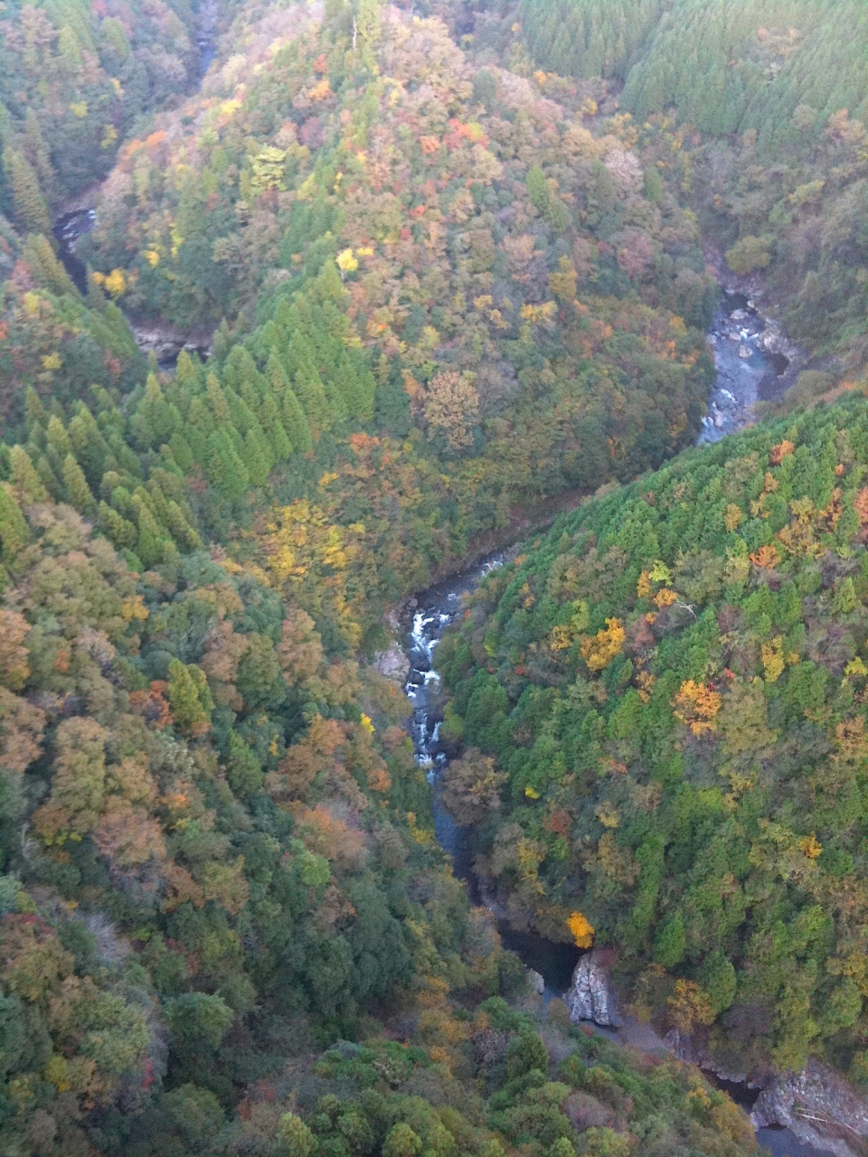 橋の上から谷底を流れる木曽川の支流、旅足川への眺望は、絶景の眺めと共に恐怖心も同時に感じることができる。