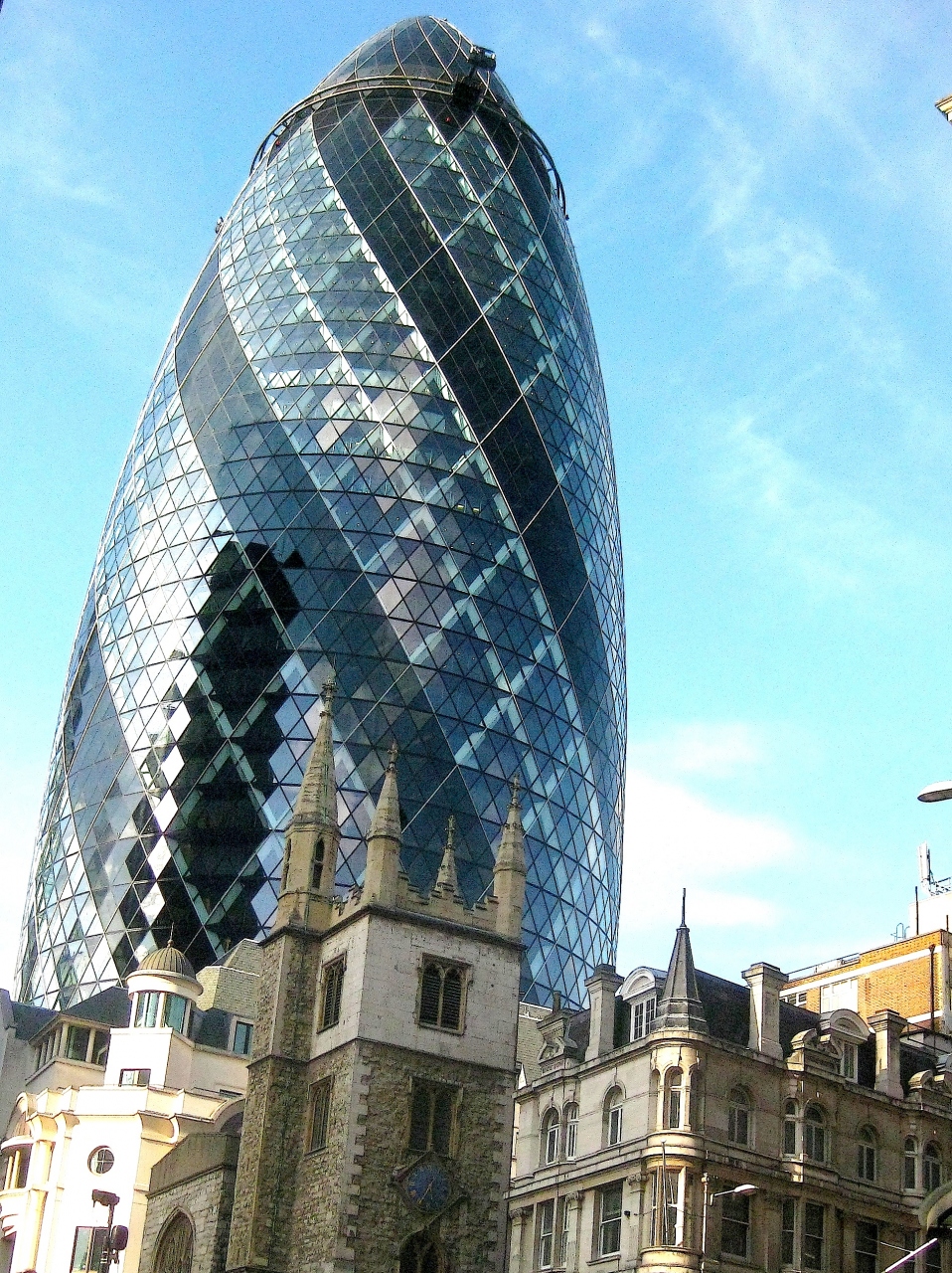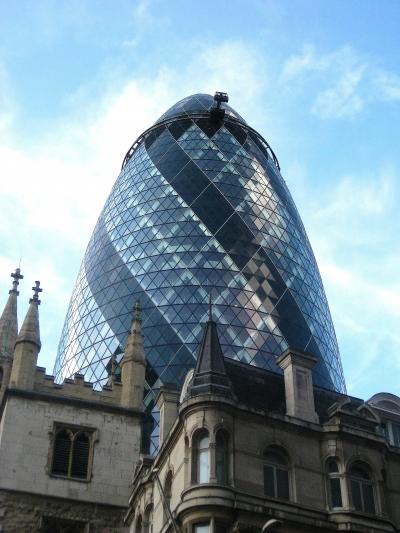 「ガーキン」の愛称で親しまれるこのピクルス型の高層ビルは、有名建築家ノーマン・フォスターによって設計された。