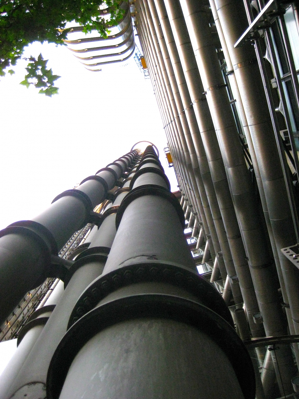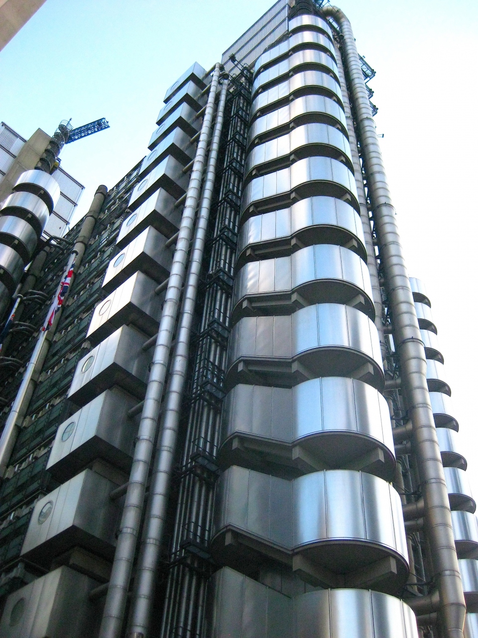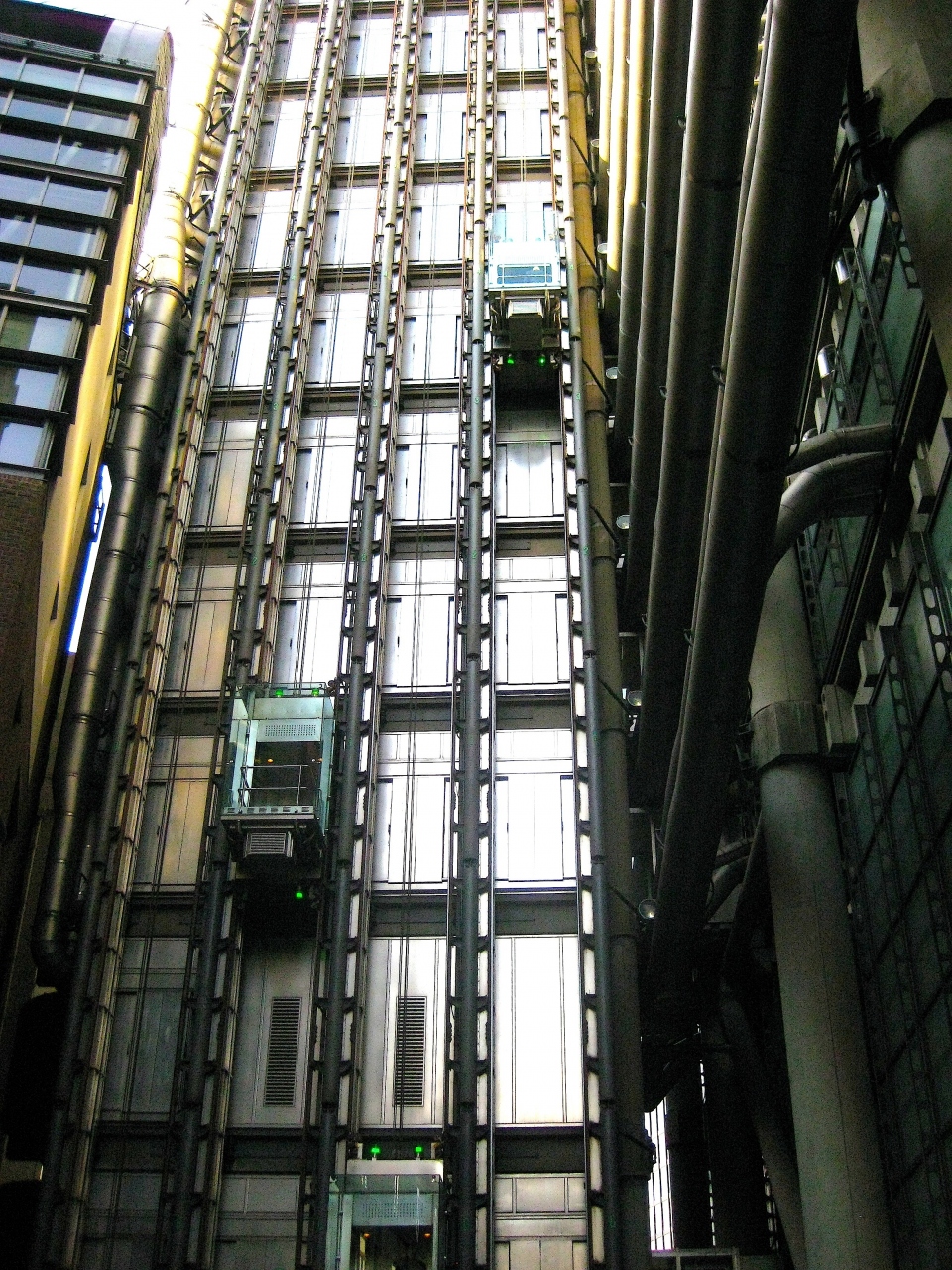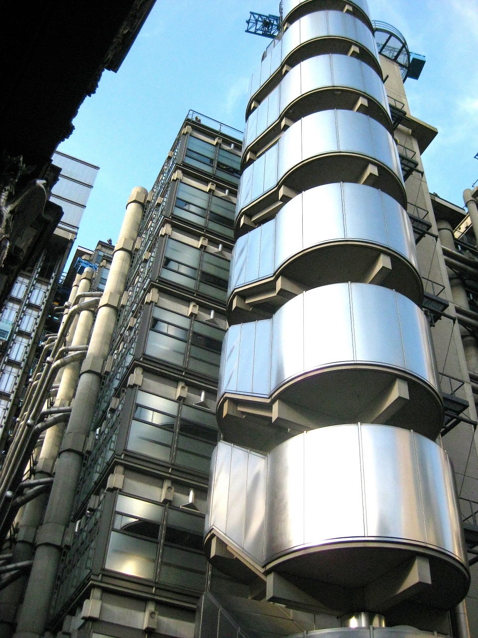 ロンドンの金融街のど真ん中、世界的に有名なロイズ保険の本社ビルで1986年に竣工。建築家リチャード・ロジャース氏が手掛け、パリのポンピドー・センターと並ぶ最高傑作のひとつ。