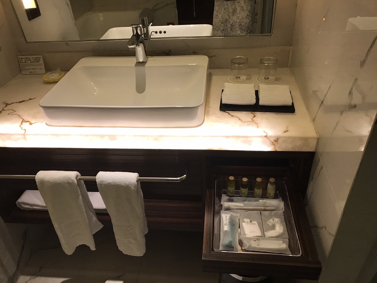客室にはワイングラスや、分厚い生地のバスローブ、オリーブオイルから作られたシャンプー・リンス・シャワージェル・乳液が備え付けられていて、さすが高級ホテル!