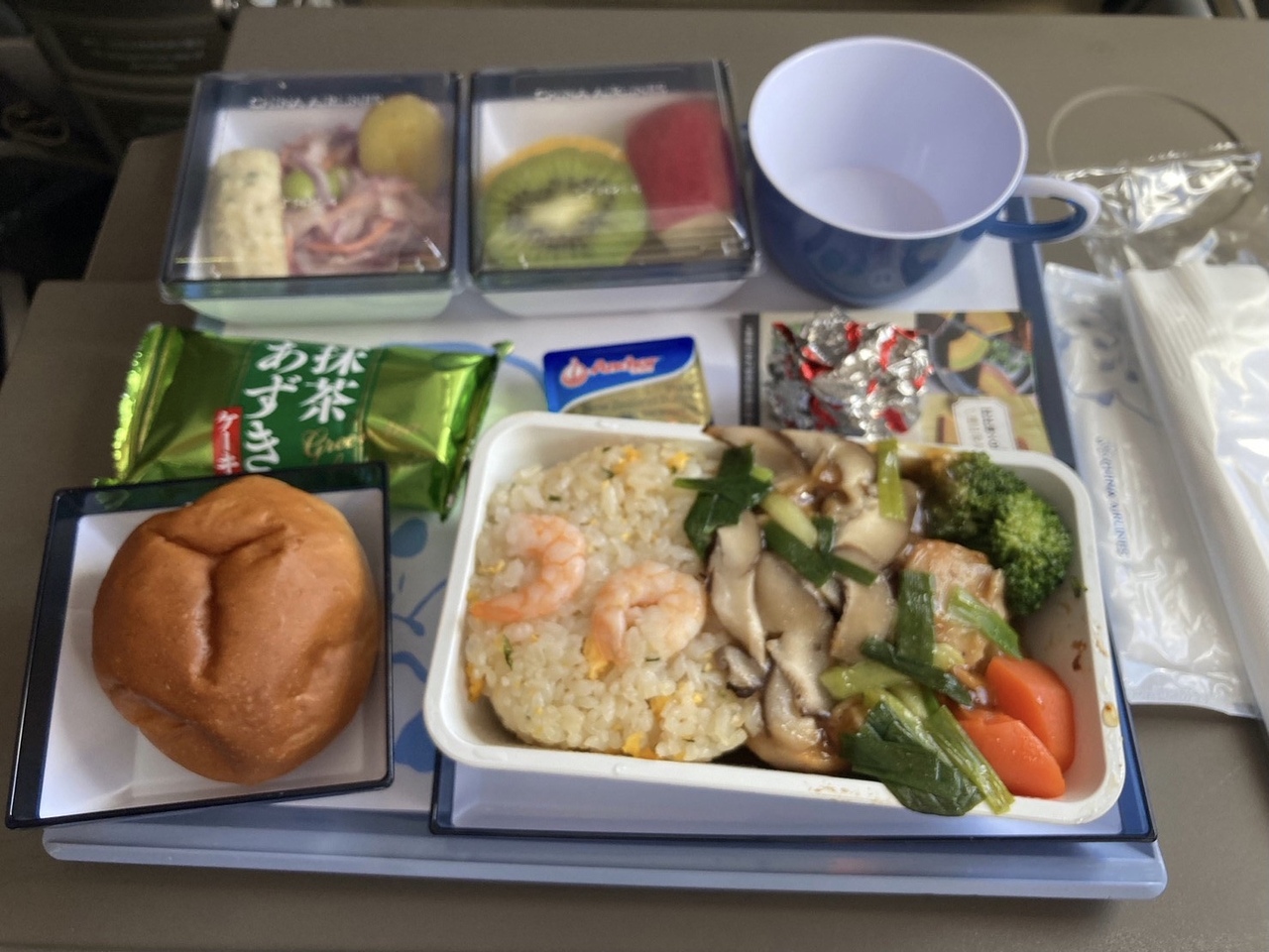 機内放送は台湾華語と英語で行われた後に、日本人CAさんに交代して日本語でも行われました。日本語が話せるCAさんが3人乗っていたそうですが、私の近くはあまり通らなかったです。台湾人CAさんには、日本語より英語(中学レベルて発音めちゃくちゃ)で話した方が通じる感じでした。冷房が効いてたのでブランケットを借りました。