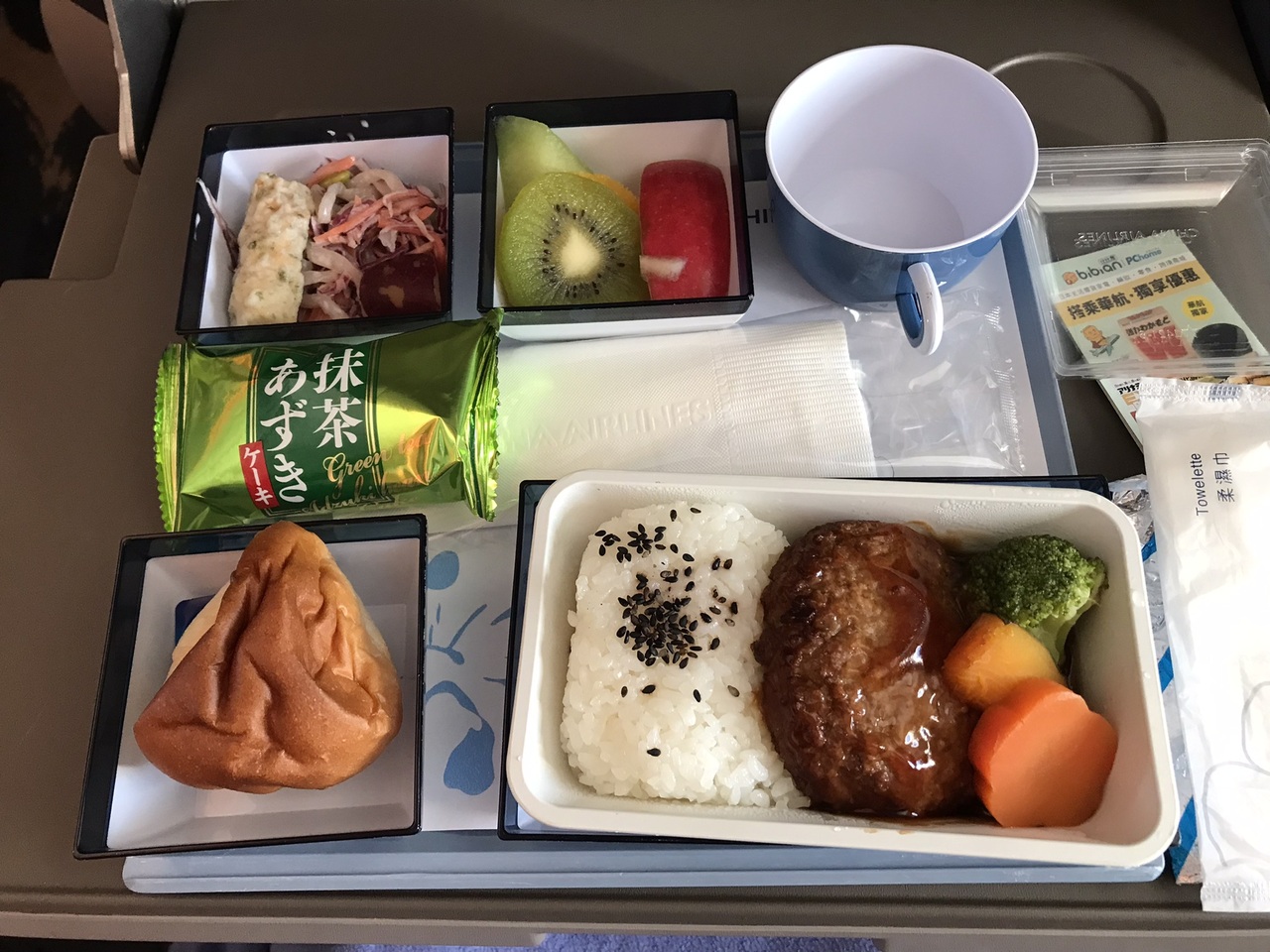 行きの機内食は中華風チキンとキノコのソテー(写真4枚目)と、和風ハンバーグ(写真5枚目)の2種類から選べました。エコノミーと同じメニューのようです。見た目以上においしかったです。特に和風ハンバーグはしっかり肉々しくてボリュームもありました。着陸後すぐに夕食を食べるからパンは残そうと思ってたのに、温められていて美味しかったから完食。食後にコーヒーまたは紅茶も提供されました。