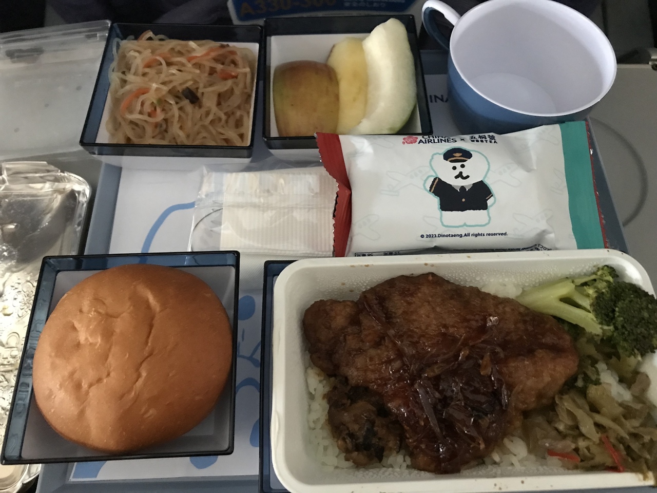 機内食は豚肉(ソースカツみたいな感じ、写真6枚目)と親子丼(写真7枚目)の2種類。 フルーツはリンゴ2切れとグァバ1切れ。 クマちゃんイラストのはマドレーヌ。美味しかったです。