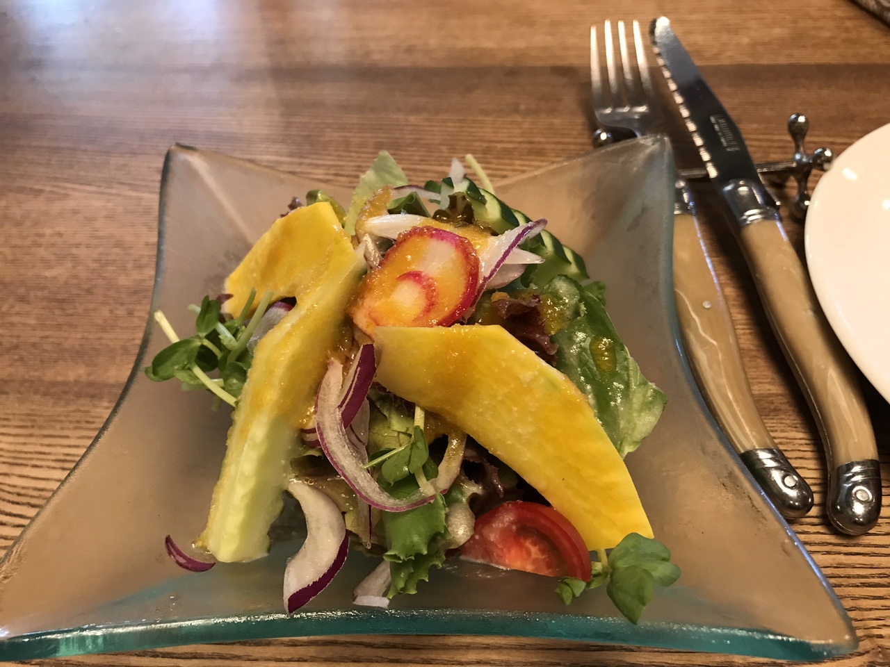 サラダはきゅうりの飾り切りが素敵だし、コリンキーやラディッシュ、紫玉ねぎが彩良く盛られてました。そこにすりおろし野菜たっぷり入ったドレッシングがかかってました。