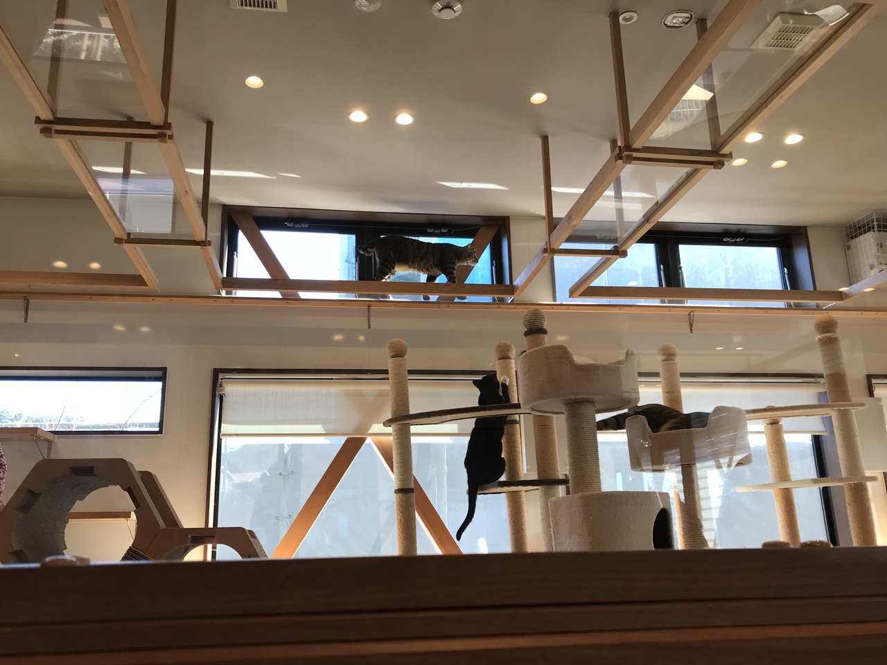13:00~13:15頃に猫ちゃん達もお昼ごはんのカリカリを貰ってました。この時間になると普段は隅っこで寝てる猫ちゃんも起きてくるので、そんなにたくさんいたのか!と驚きます。食後に顔洗いする様子も見られて最高!ガラスやキャットウォークも手入れが行き届いており、下から見上げる肉球もたまらない!猫グッズやハンドメイド雑貨の販売もしてます。猫好きさんは是非!