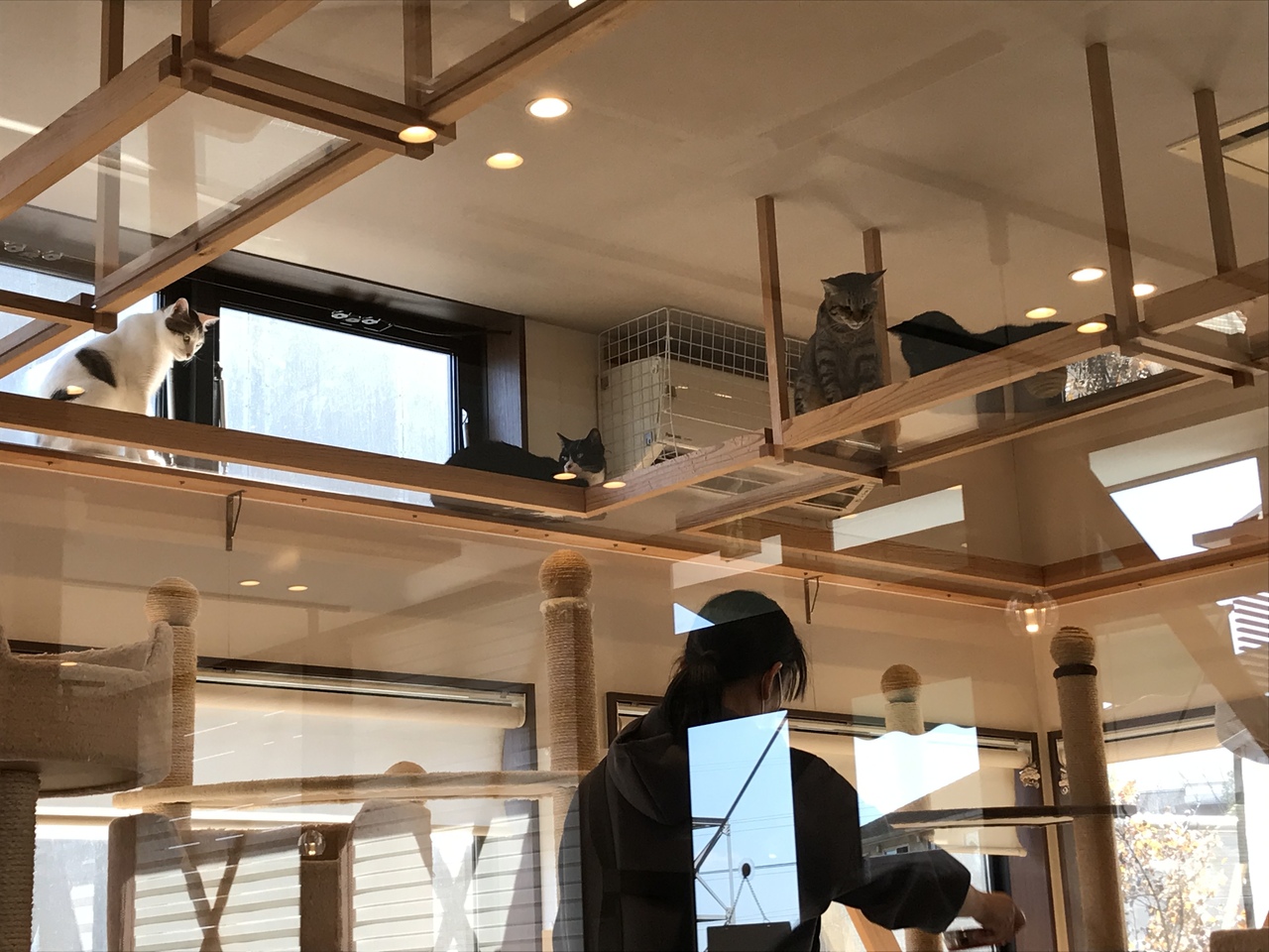 レジ前の席からはあまり猫ちゃん見えません。猫ちゃんを見たいなら展示ガラス側、特にカウンター席が良いです。