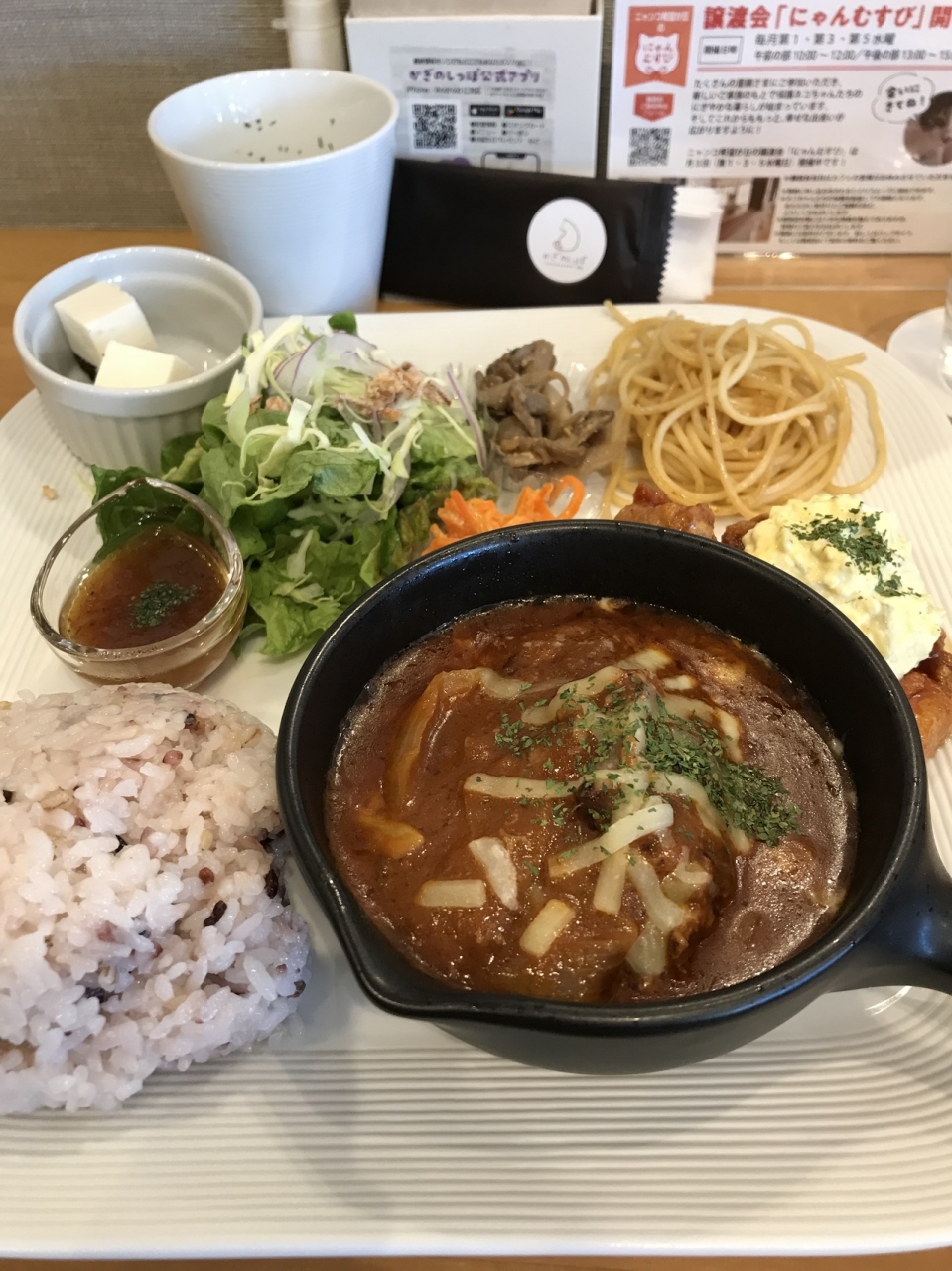 食事も美味しかったです。私の写真では伝わりづらいですが、鶏南蛮3個あり、大きな煮込みハンバーグあり、ミニデザートまで付いててとてもボリュームありました。ごはんは少なめにしても良かったかも。