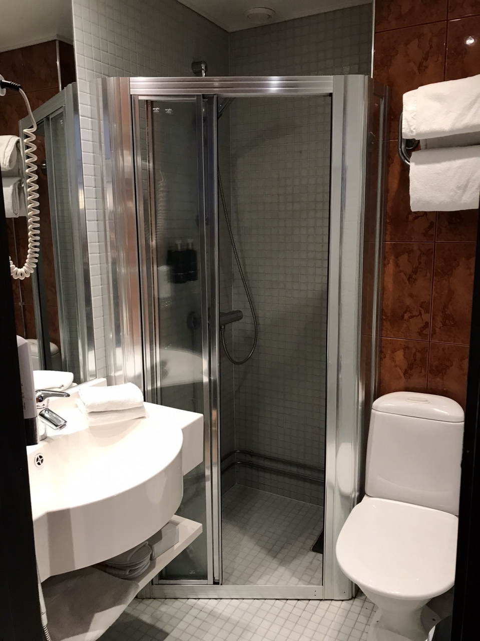シャワーを浴びるとトイレや洗面台の方の床までビショ濡れになります。備え付けのワイパーで水切りする必要があります。フィンランドはこのタイプのホテルが多いようです。サウナ用に持参していたビーチサンダルが重宝しました。