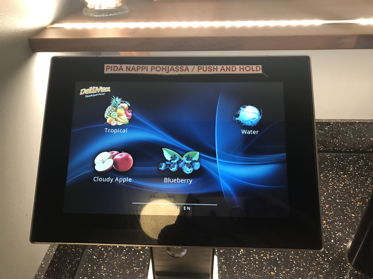フロント前にブルーベリージュースとデトックスウォーターがありました。24時間置いてありそうです。コーヒーと菓子パンの有料販売もあるようでした。