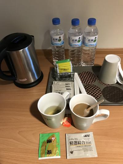 2人で泊まりましたが、ミネラルウォーター、マグカップ、お茶類は4つずつありました。飲み物は緑茶、烏龍茶、砂糖ミルク入りのコーヒーの3種類でした。