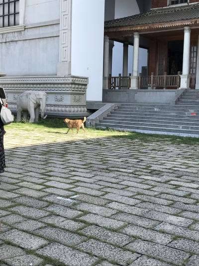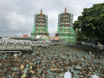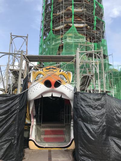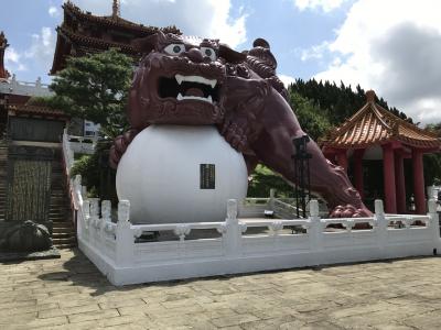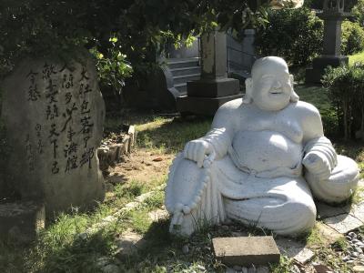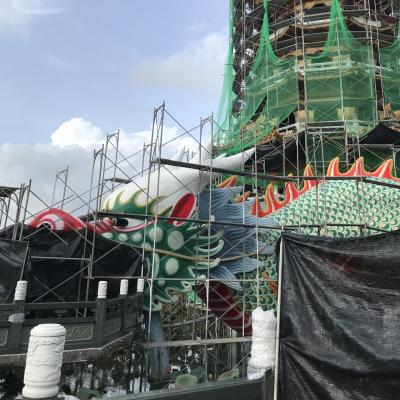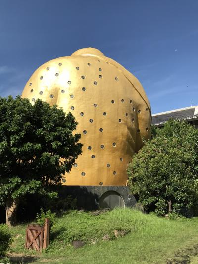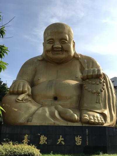 裏手にある金色の布袋様は高さ30mあるそうです。昔は中に入って登れたそうですが、今は立ち入り禁止になっているとの事。背中にたくさんの丸窓があります。