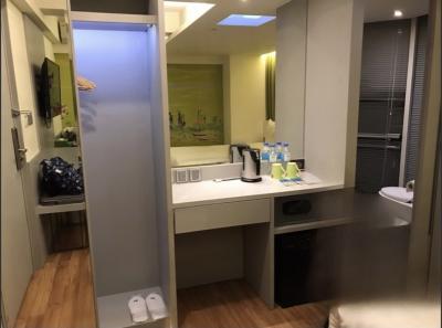 【2枚目】入口から左を見た所。クローゼットのドアが鏡貼り。その隣の机の前も鏡だから部屋が広く見えます。500mLミネラルウォーター、お茶、ミルクと砂糖入りのインスタントコーヒーが2つずつ置かれてました(2人で宿泊)。