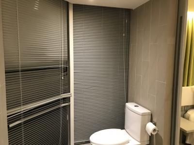 【3枚目】トイレ。角部屋で無駄に見晴らしが良い。ブラインド、経年劣化で機能を果たせてない箇所があるのが少し気になります。