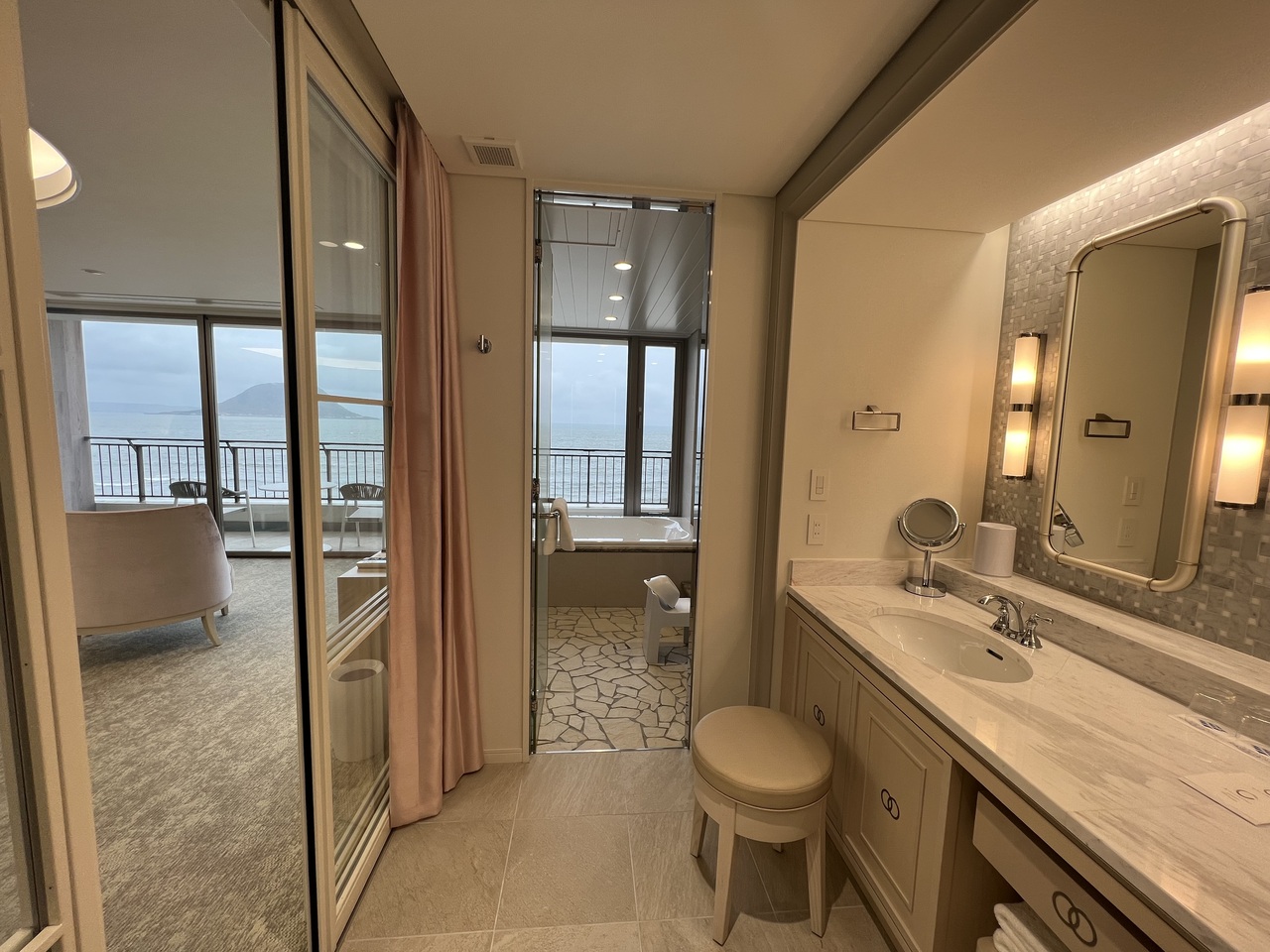 打ち合わせできるほどのスペースに海が見えるバス、ベッドなど、どれも快適でした。