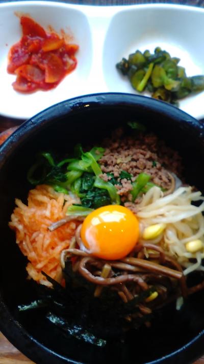 熱々のビビンパと、カリッパリっのチヂミ。梨ジュースでお口なおし