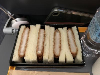 機内食は2種類いただいた→【カツサンド】と【チキン南蛮丼~あけぼのタルタル添え~】