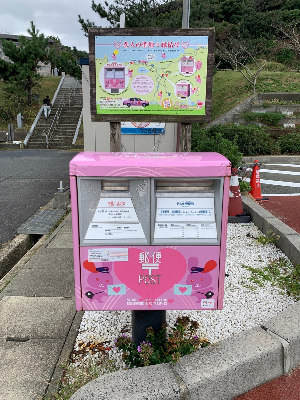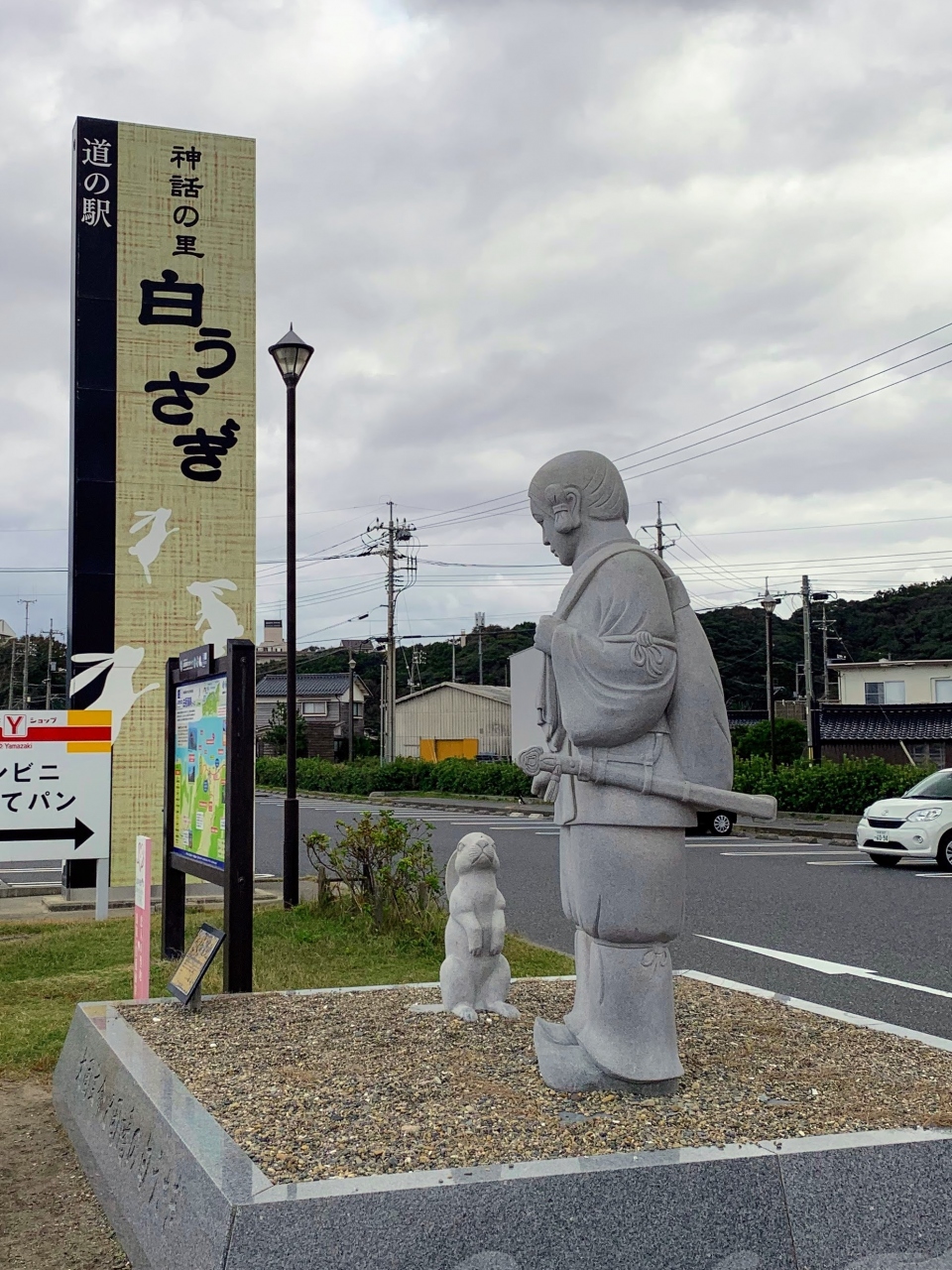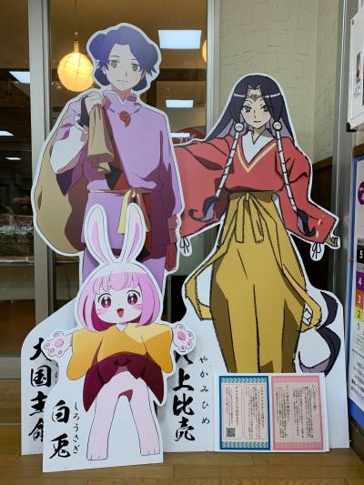 「因幡の白兎」伝説ゆかりの地ということで道の駅の中には擬人化(とう表現であっているのかな?)された白兎と大国主命・八上比売が描かれた大きなボードがありました。