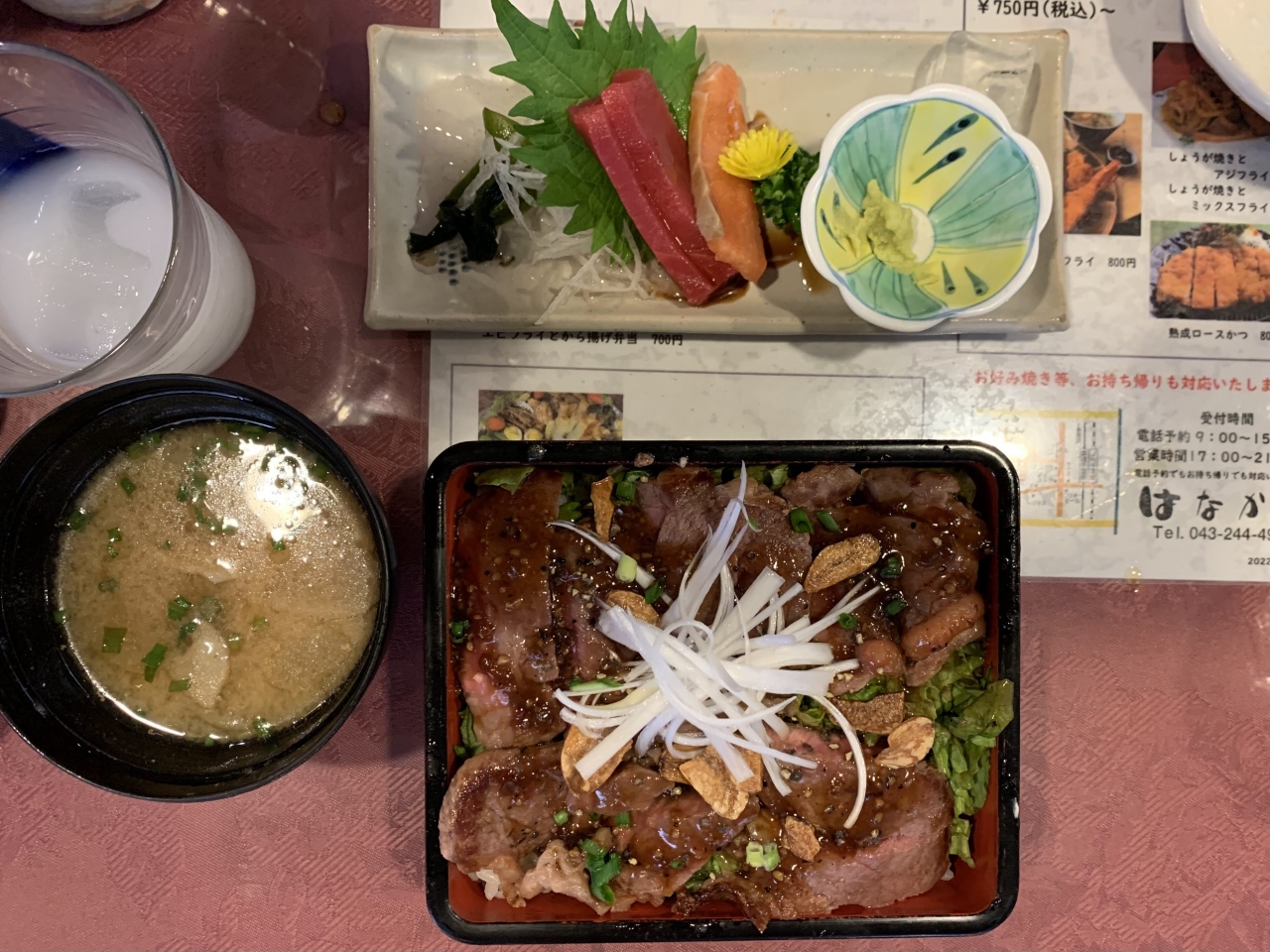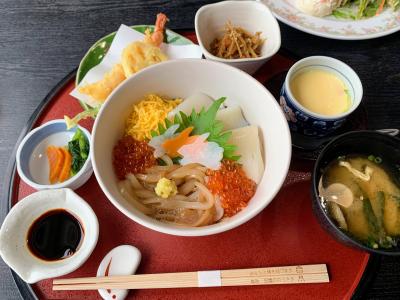 海鮮丼に天ぷらや茶碗蒸し、小鉢料理などがついたセットです。