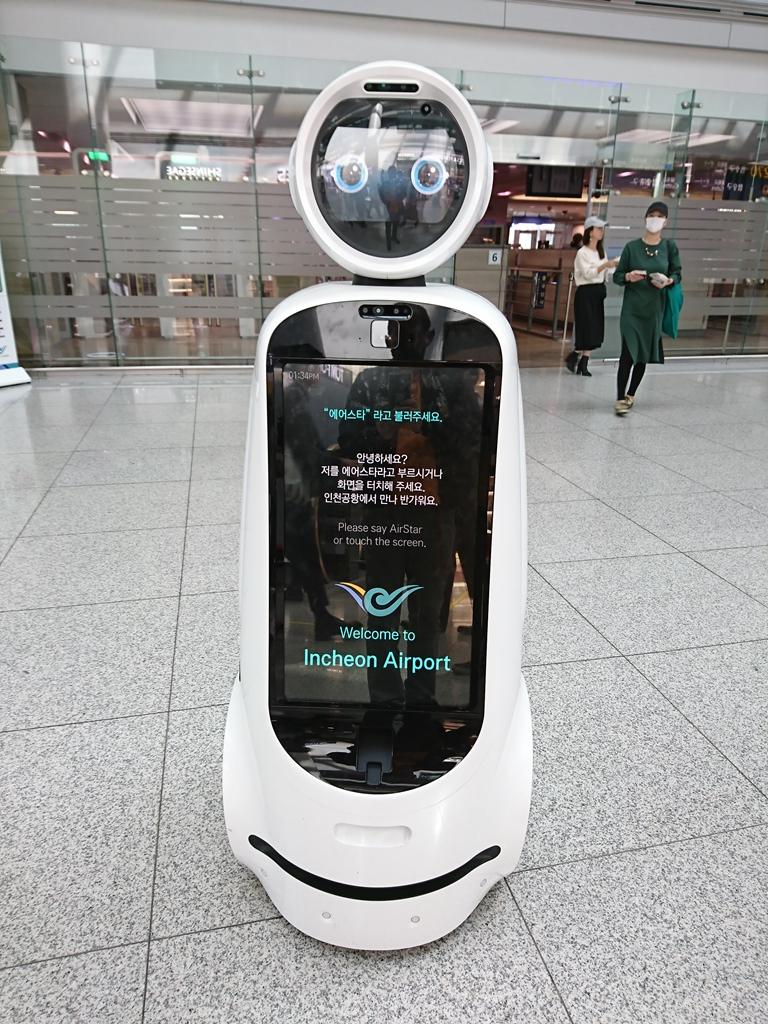 出発コンコースをあちらこちらに移動している空港案内ロボット「AIRSTAR(エアスター)」。