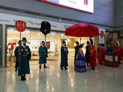 また土産を買うのに空港内をウロウロしていると歴史的な民族衣装を身に着けた一団がどこからともなく現れてちょっとしたアトラクションが始まったりします。