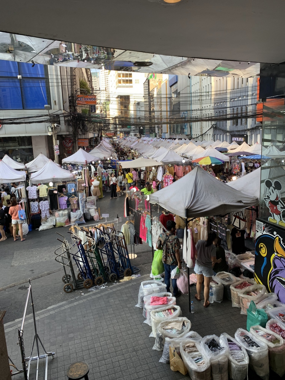 ARLの「ラチャプラロープ駅」からすぐそばの【バイヨークスカイホテル】。そのホテルの目の前から南の方角に数えきれないほどの露店が連なっています。
