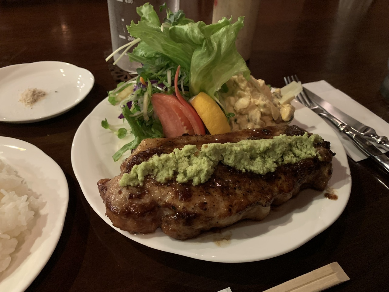 極厚ポークソテーの脂は甘味があり、たっぷり乗せられたワサビの辛味を相殺してしまうホド(^^)