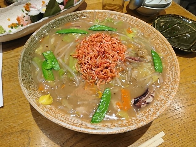 私が注文したのは「特盛り魚貝刺し」「北の海あふれ寿司」「豪快 海鮮皿うどん」です。
