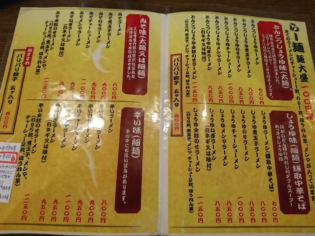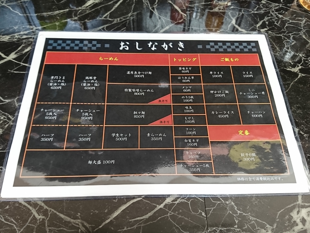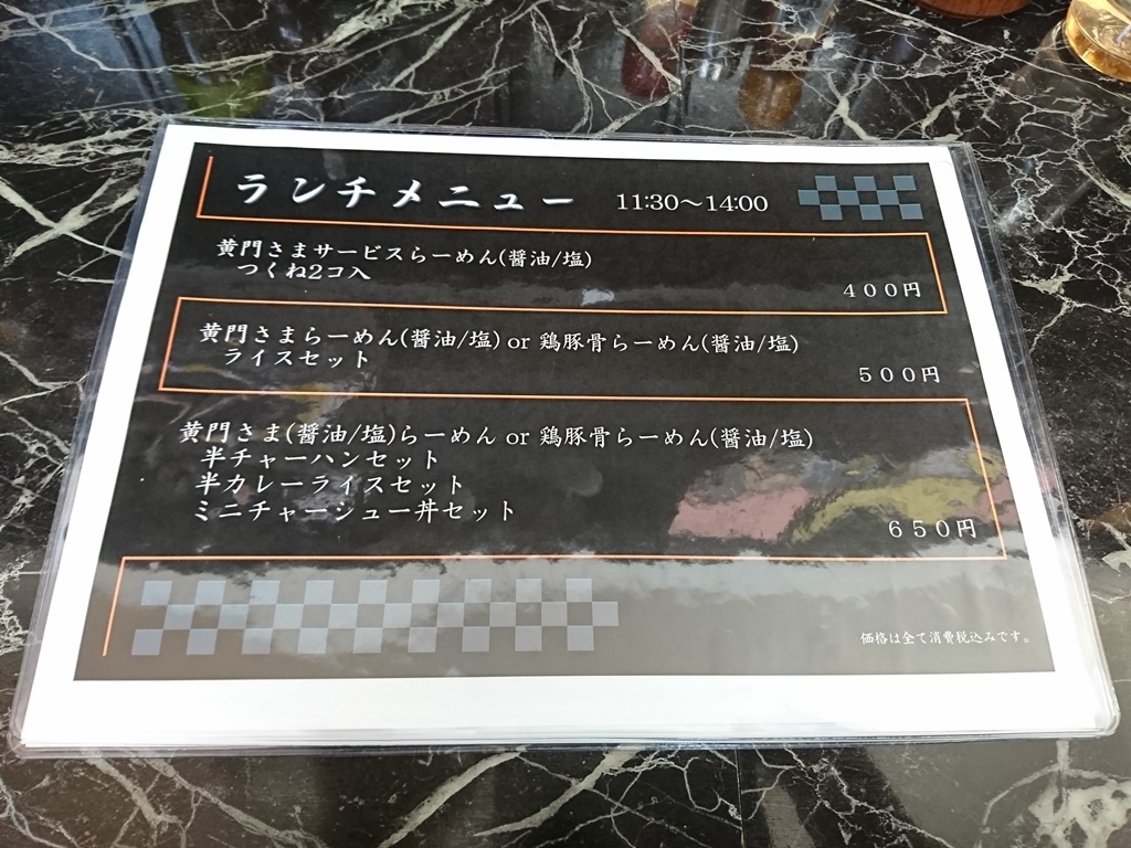 店名を冠した「黄門さまらーめん」(醤油・塩)のほか、鶏豚骨らーめん(醤油・塩)、特製味噌らーめん、担々麺、濃厚魚介つけ麵があったが、最近のラーメン屋の中ではメニューは少ない方だと思う。