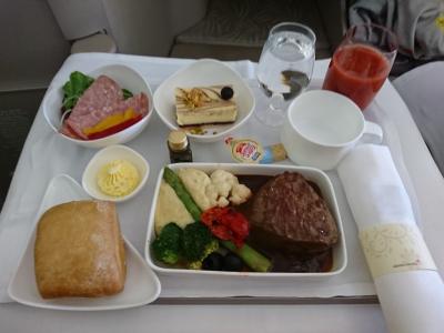 仁川からの復路便の「ステーキ」はけっこう美味しかったのですが、途中で飽きるほど大きかったです(^^;;- 旅行時期