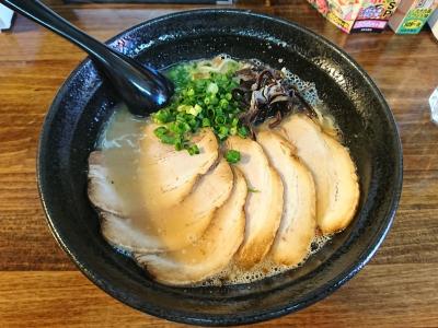 豚骨チャーシューラーメンをいただきました。あっさりめの豚骨スープに太麺がデフォルトだそうですが、麺は細麺に変更することも可能です。細麺といっても中太といった感じの麺ですが。