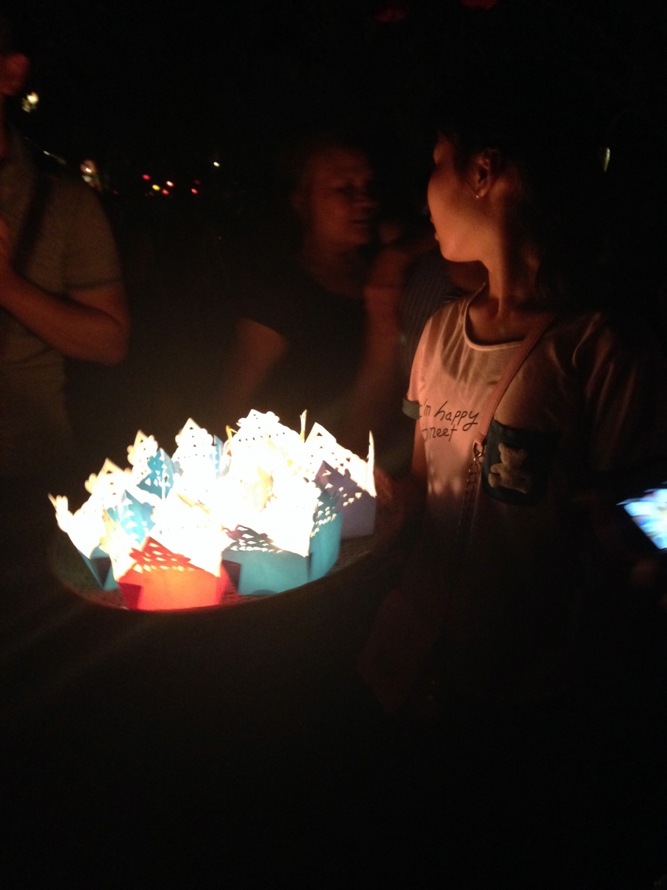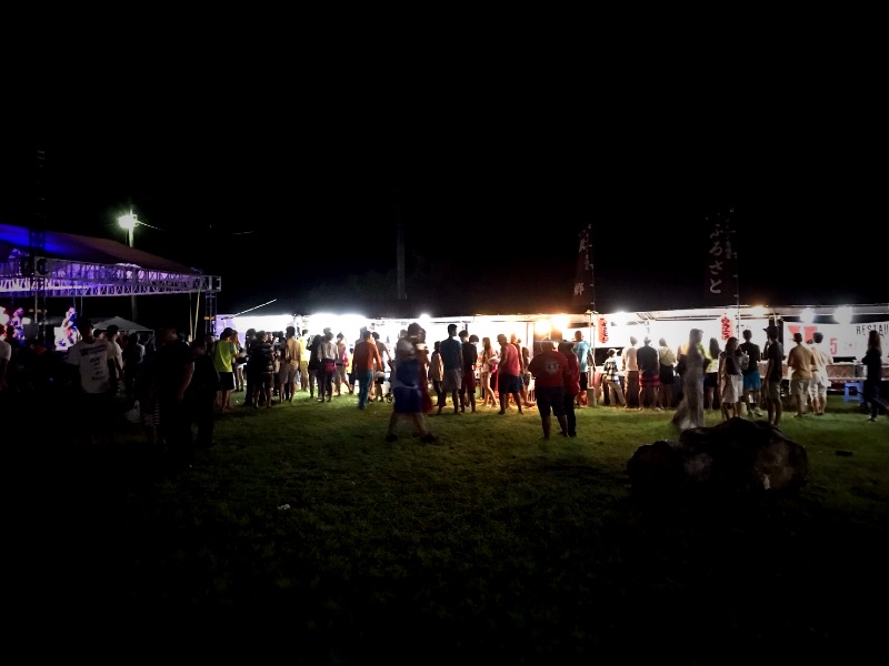 普段の日でも夕方になるとランタンが灯る、祭りの日はランタンの灯のみでだいぶ暗い