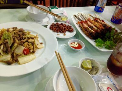 エビを焼いてもらって、焼きビーフンみたいな麺と、ビールを頼んだら何故か2本出てきてこれがまたぬるいビール