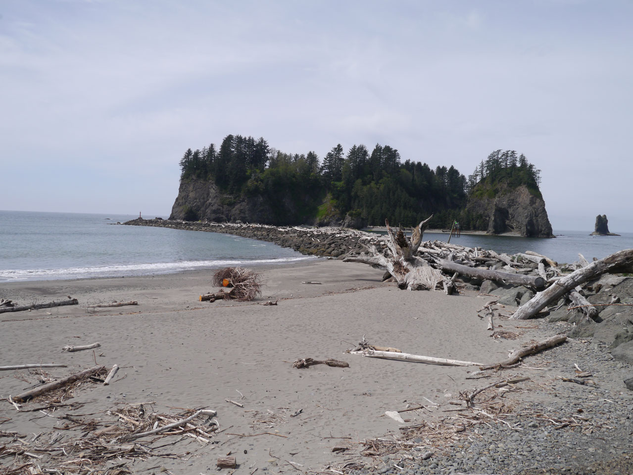 岩の島が並び海岸線には多数の流木が散らばる閑散とした風景は