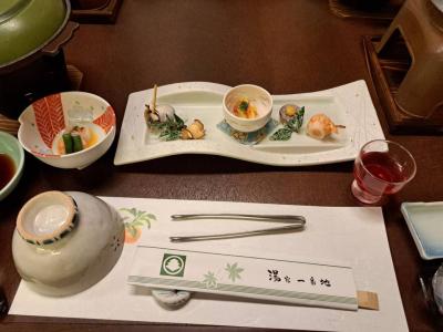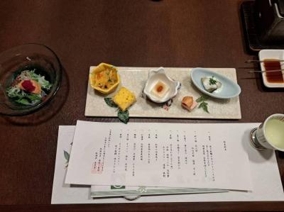 夕食のコース。柚子酒のサービスと前菜3種は洋風仕立てでした。