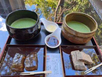 大楠を眺めながら、茶寮でお抹茶とわらび餅で一服。
