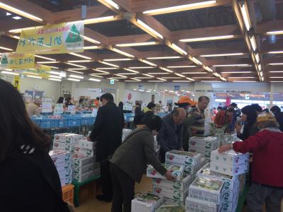 ぷりぷりのなめこやスーパーでなかなか手に入らない国産のレモンなども売っていて、観光客や地元の人などたくさんの人でにぎわっていました。