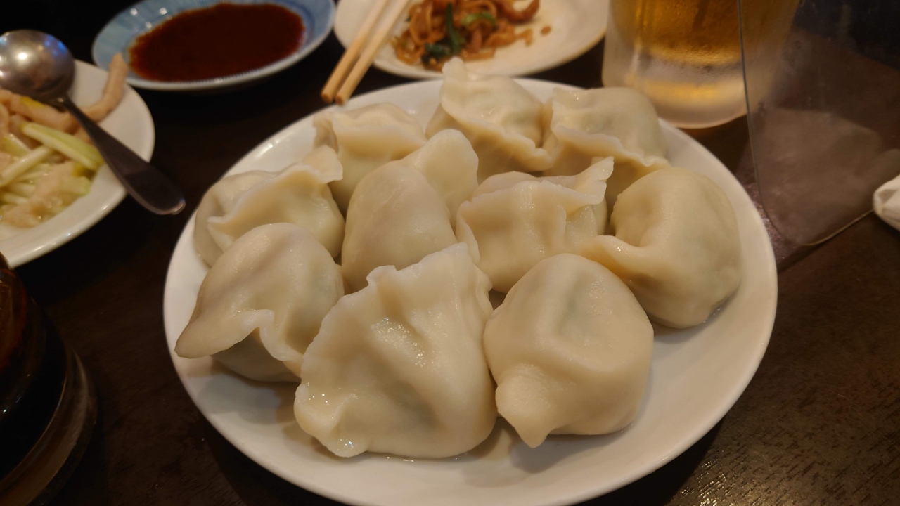 とりあえずビールを注文しようとすると、追加注文はできないと言われた。揚げ春巻き、豚肉とねぎの細切り炒め、名物らしい水餃子と生ビールを注文。基本接客が間に合っていないので、料理は冷めかけてぬるい。春巻きは、皮が全くパリパリしてなく、くにゃくにゃで油っこい。豚肉の細切り炒めは調味料を入れ忘れている。名物の水餃子は皮がねとねとなのに粉っぽい。今まで食べた水餃子の中で1番不味い。たれもテーブル分ないので、1階の席の中で融通しあってつかう。