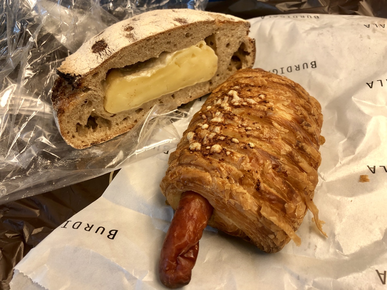 今回は、クロワッサン生地の中にソーセージが入ったパンとカマンベールが丸々一個入ったハード系のパンをハーフで買いました。
