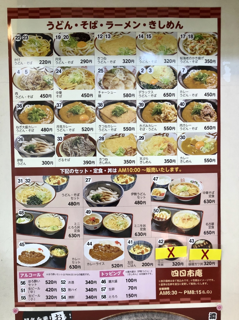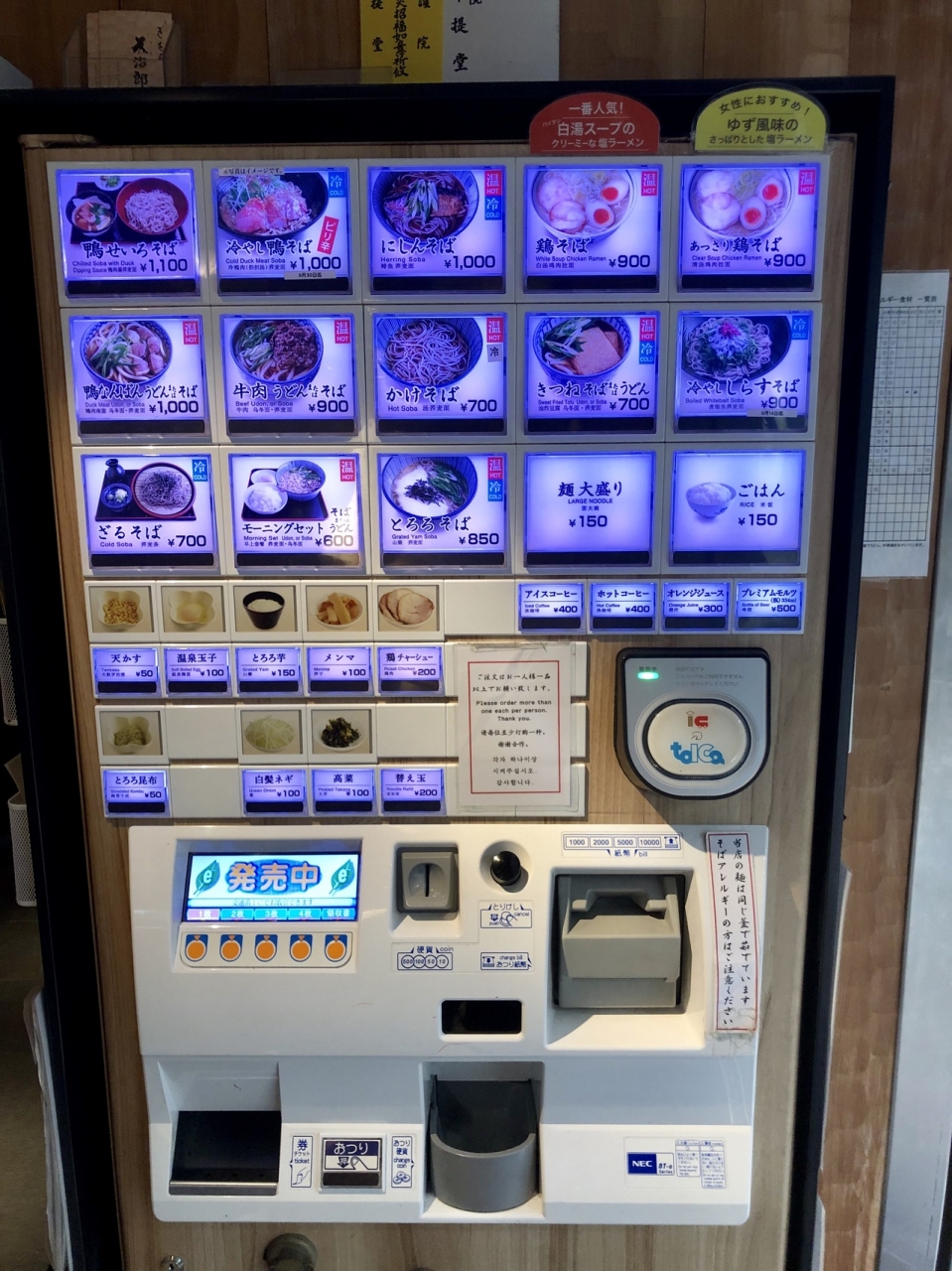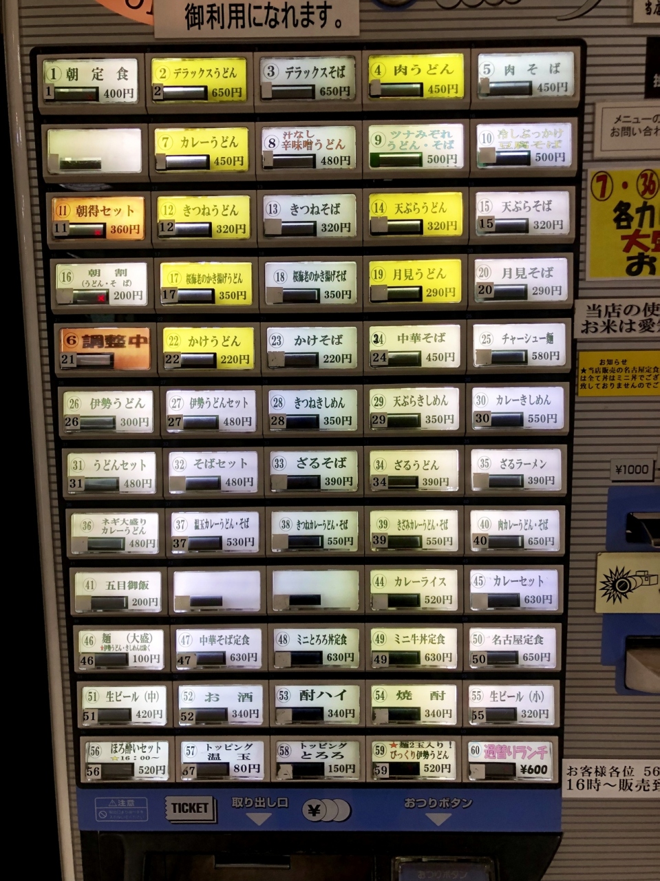 メニューはうどん、そば、ラーメン、きしめんそして伊勢うどんまである充実ぶり、券売機のボタンの数も多いですね。