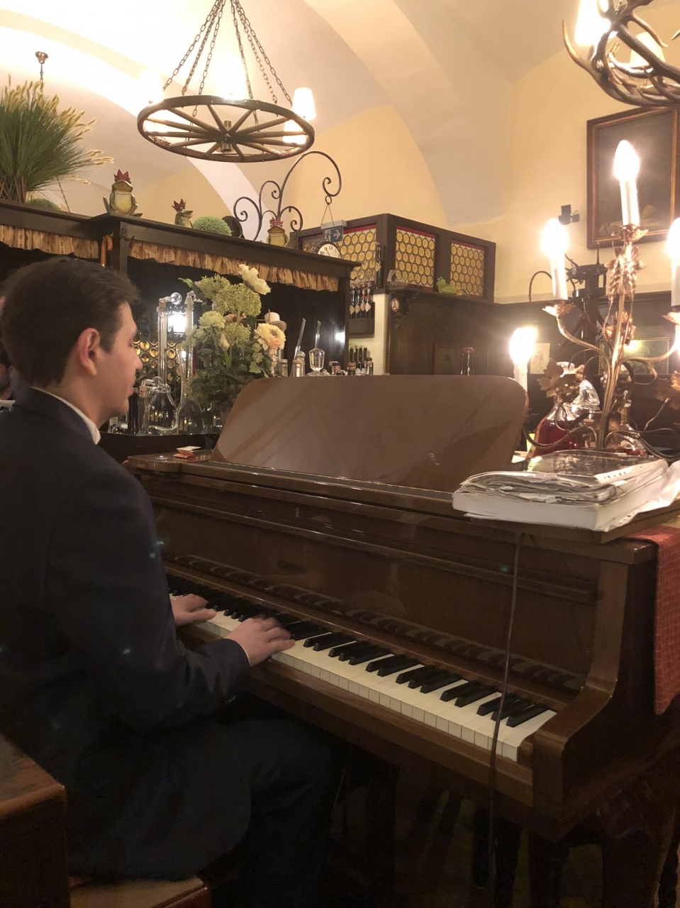 周りの人はケーキを食べていますが、big香港家は、ばばはシュニッェル、じじはマスのソテーを注文しました。ウェイターのおじさんが「さかな、さかな」と楽しそうに注文をとってくれました。