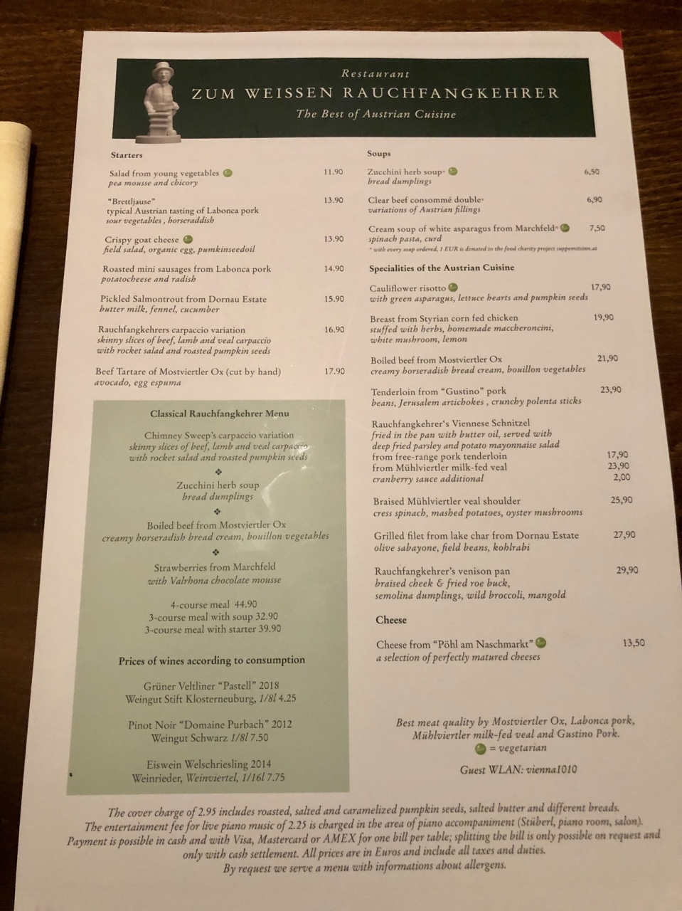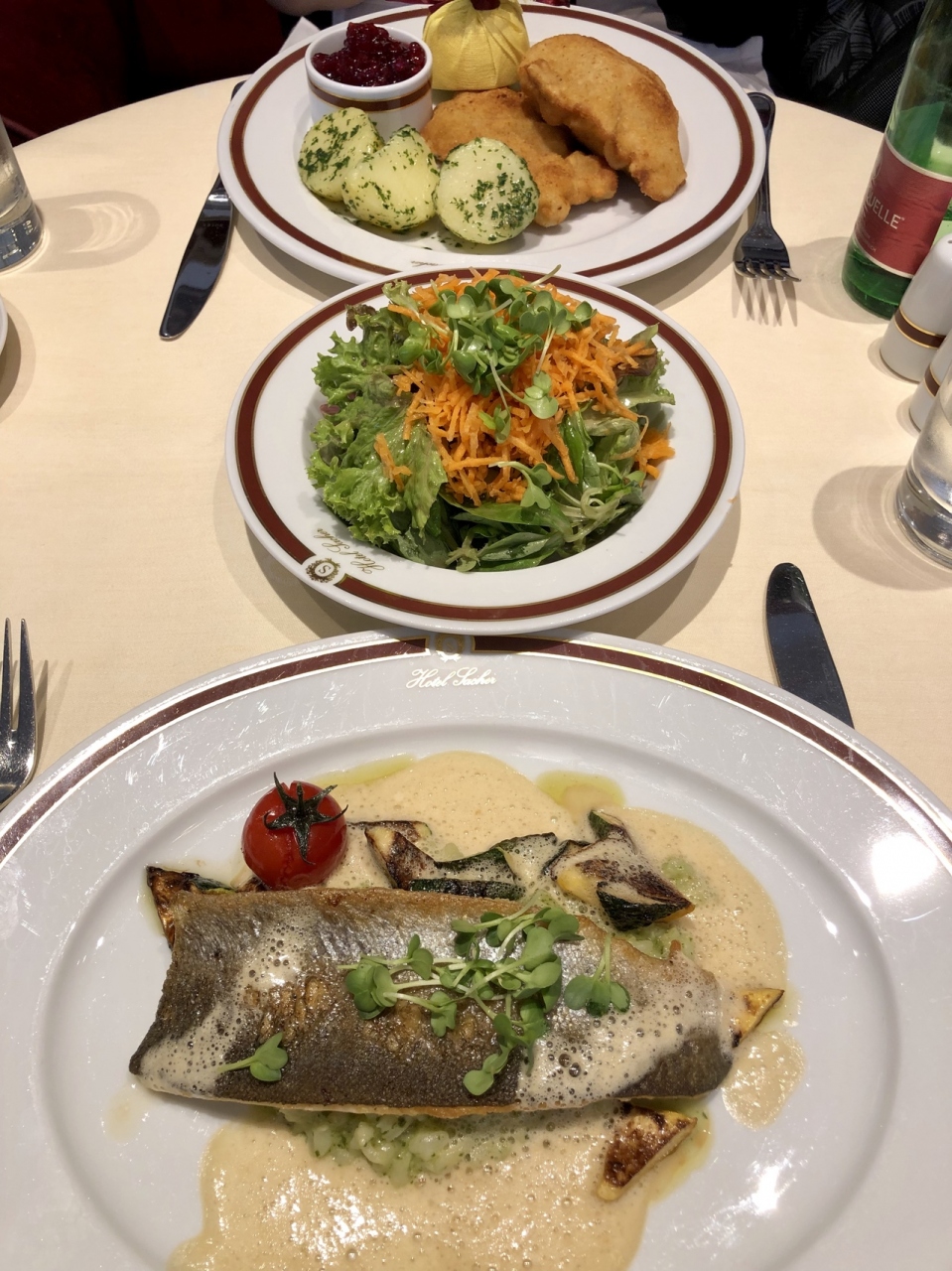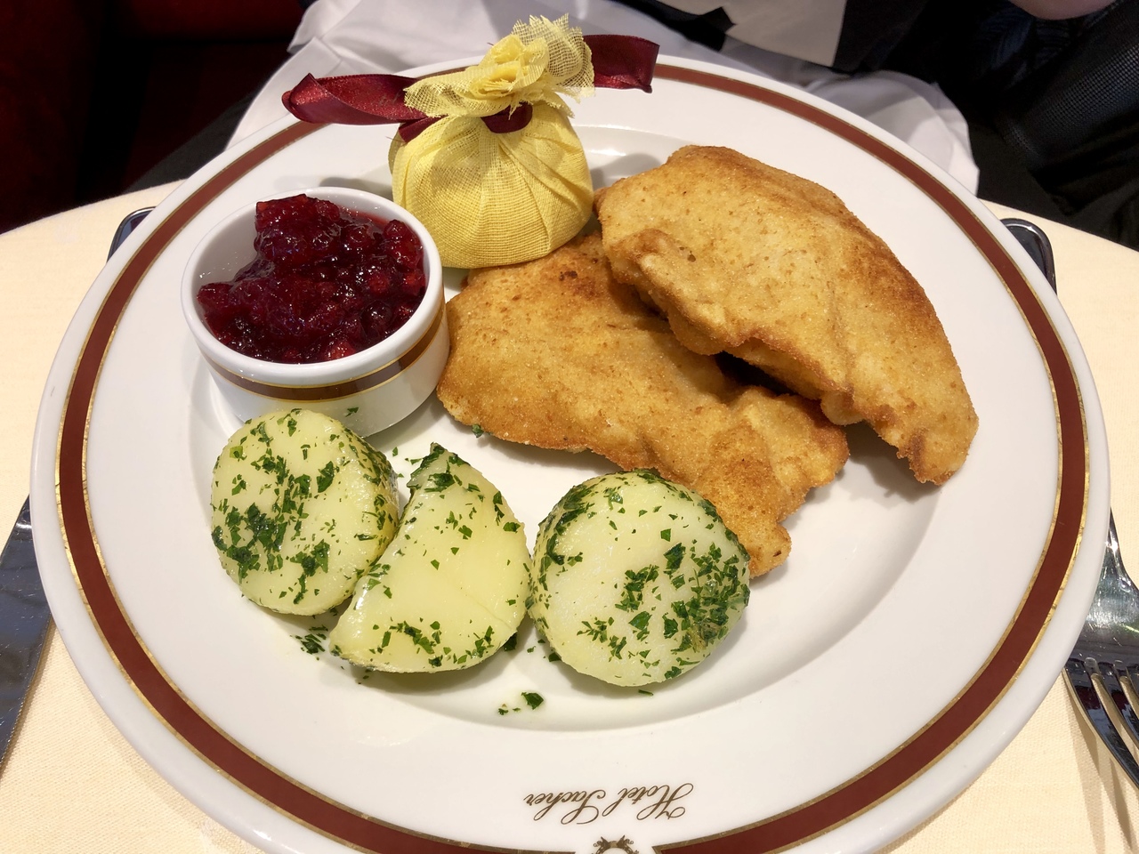 シュニッツェルと魚料理、食後のデザートはもちろんザッハートルテとザルツブルガー・ノッケルンをいただきます。