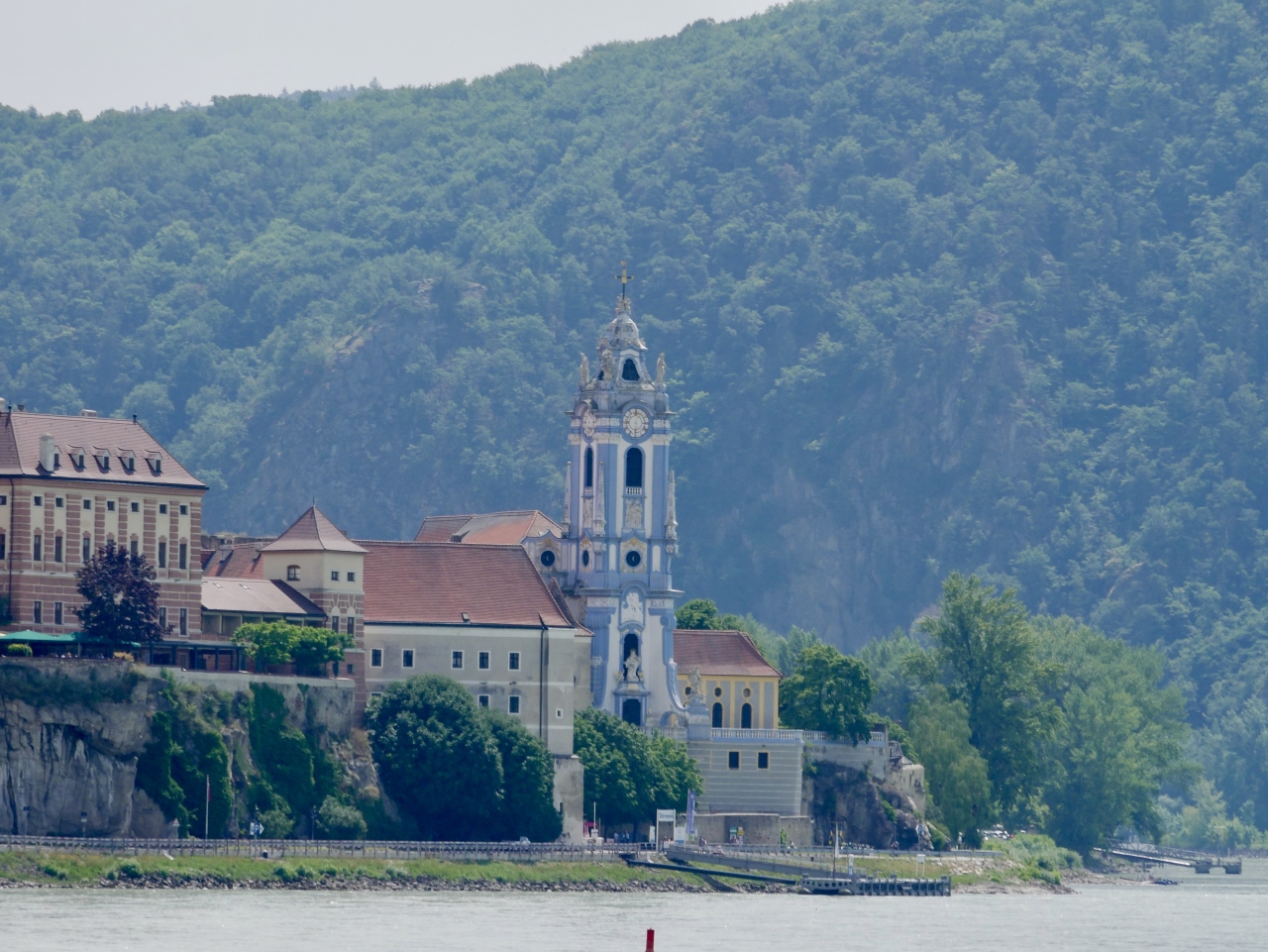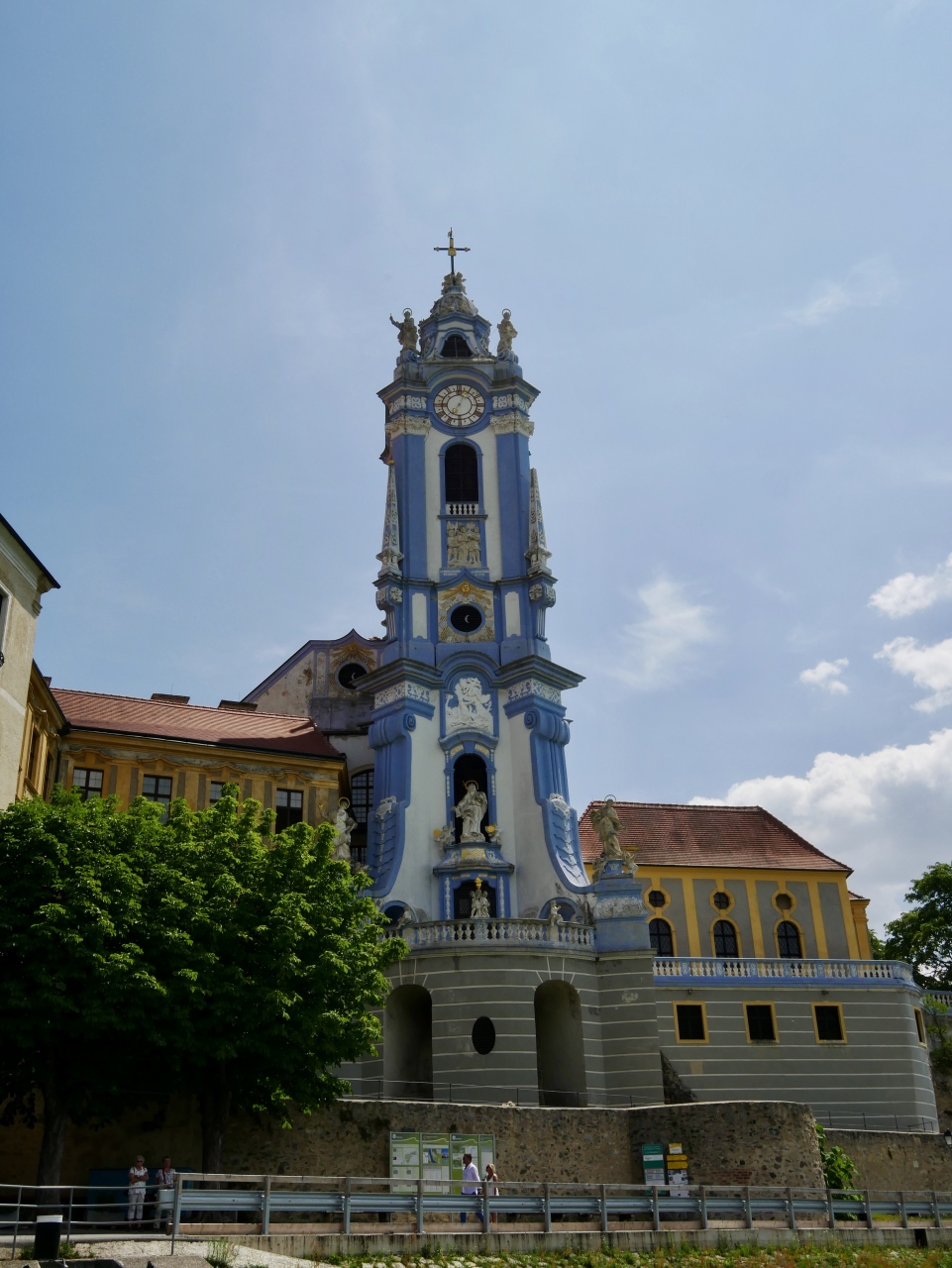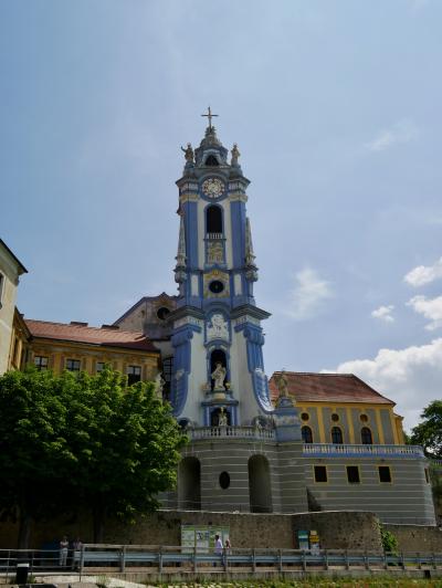 デュルンシュタインのドナウ川のほとりに建つ淡い蒼い色の聖堂参事会修道院教会です。