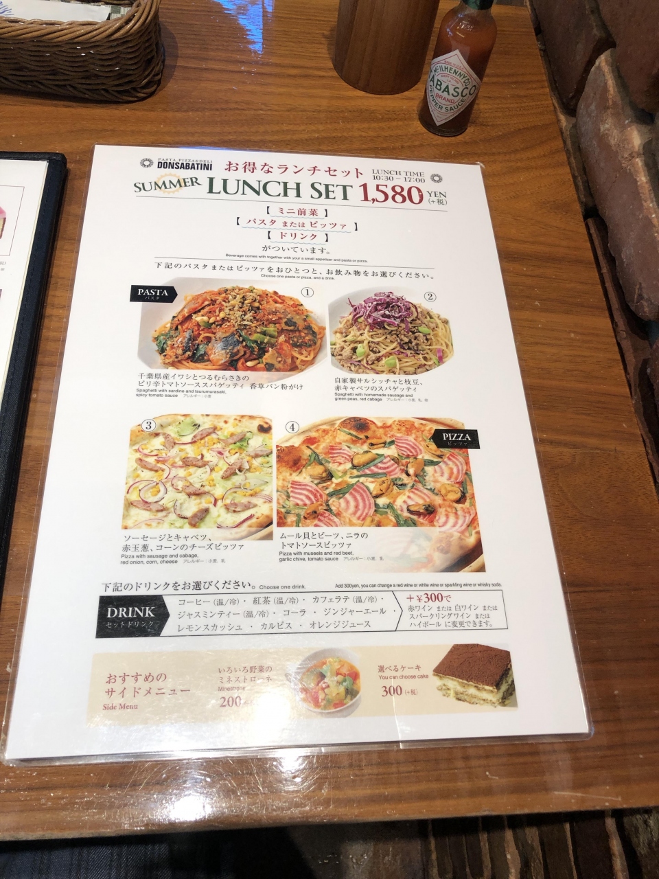 一見、高いように見えますが、こちらのピザは35cmくらいの大きいピザでランチセットだと1580円で前菜とドリンクも付いてくるのでお得ですね。