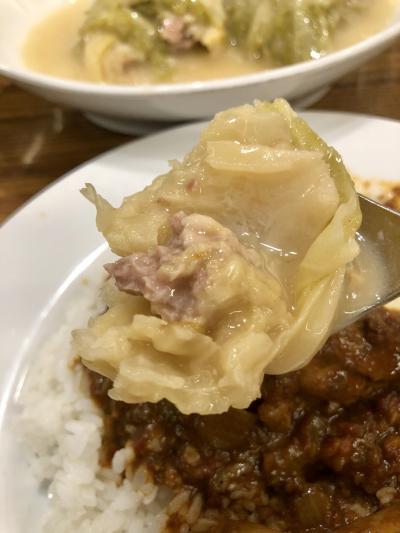 外食としては初めて食べるロールキャベツシチュー。キャベツの歯ごたえもよく中の挽肉はジューシーで美味♪( ´θ`)