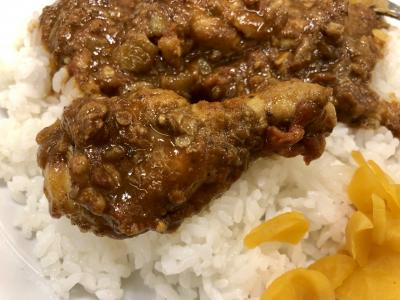 カレーをライスに注ぐと骨付き手羽元が2本入っていてボリューム感良いですね。極辛となっていますがピリッとスパイシーでコクがあり丁度いい辛さです。手羽元もホロホロで美味しい。(^。^)