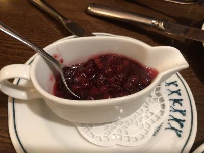 こちらのシュニッツェルは熱々でやってきました。衣もサクサクでしつこくなく美味しくいただけます。クランベリージャムも甘過ぎずシュニッツェルとの相性も最高です。