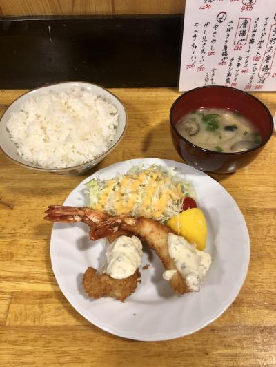 夜メニューはおかずだけですが定食も出来るとのことで特大エビフライ定食を注文しました。