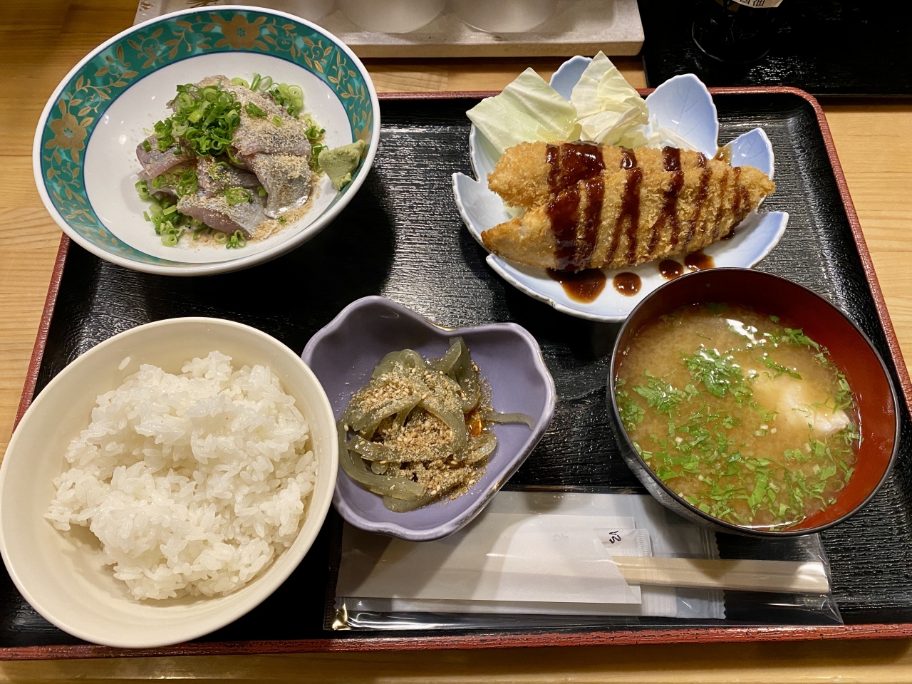 料理はあじごま、白身魚のフライ、おきゅうと、潮汁味噌仕立てとご飯とボリュームたっぷりです。